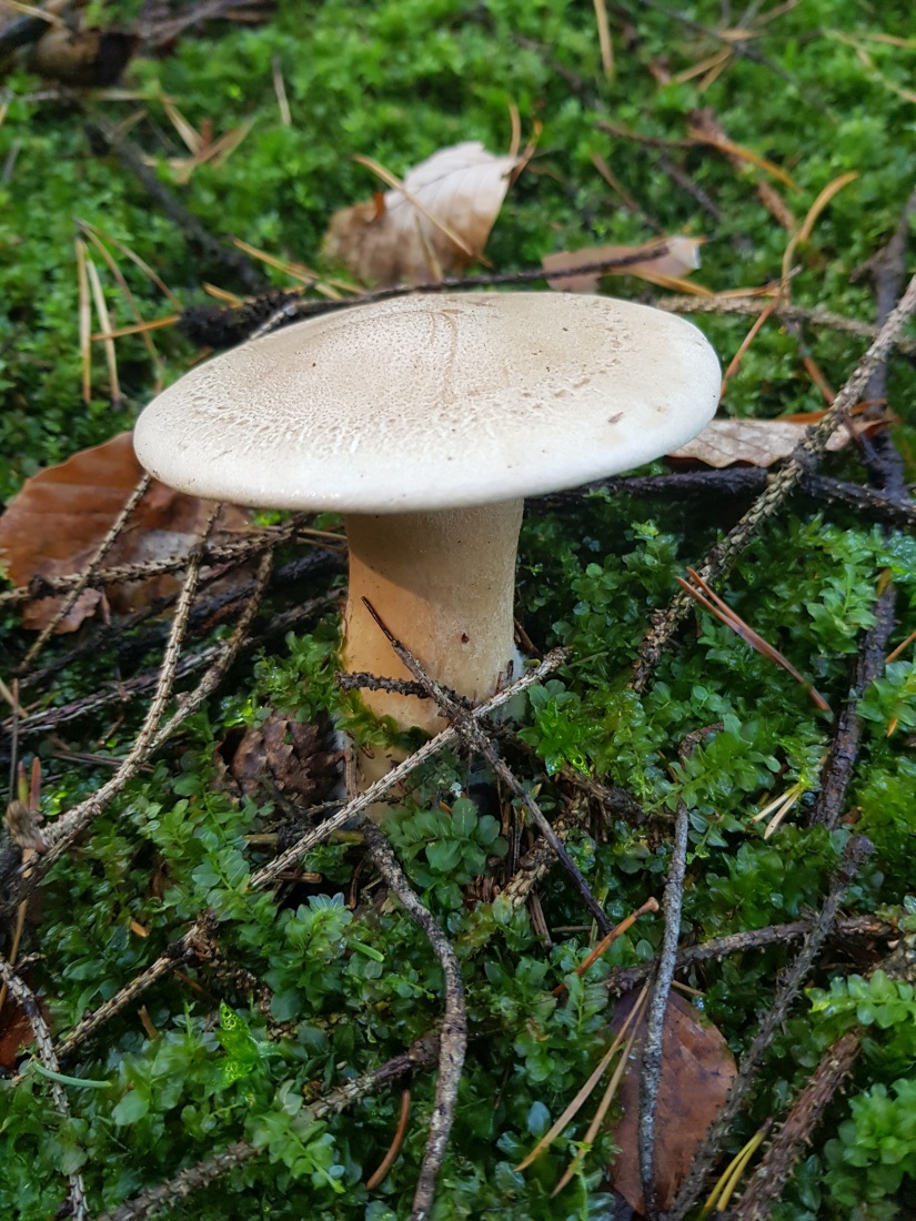 Der folgende Fund Fund von gestern lässt mich noch etwas ratlos zurück. Gefunden im Fichtenwald auf Kalk. Wuchs in einer größeren Gruppe im Hexenring. Grundsätzlich erinnert mich die Statur, Farben und (zumindest entfernt) der Geruch an den Mönchskopf; diesen kenne ich aber nicht mit einem derartig stämmigen Stiel, außerdem fehlt der Buckel. Ein eine andere Clitocybe? Oder Leucopaxillus? Ich Freue mich über Anregungen.