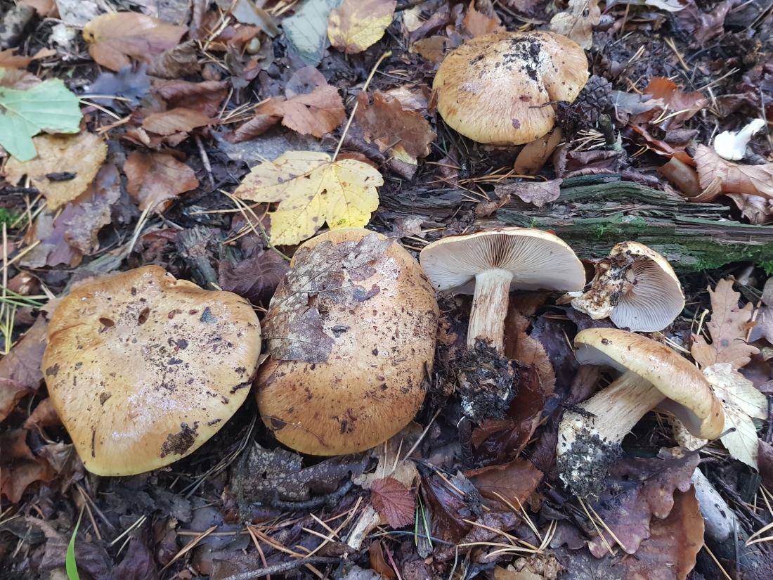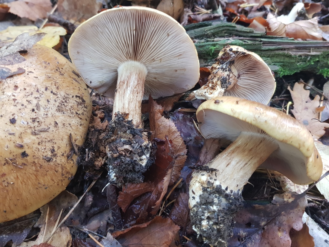 Fund 1 scheint viel weiß(lich)es Velum auf dem Hut zu haben, das könnte dann eventuell in Richtung Cortinarius langei gehen. Bei Nr. 2 und 3 sieht man leider die Lamellenfarbe gar nicht bzw. unzureichend, d. h. zumindest ich habe dann nicht mal die Chance auf eine Idee. Nr. 4 ist augenscheinlich ein Calochroi, welcher um KOH für seine Huthaut und den Knollenrand geradezu bettelt und dann vielleicht so was wie C. catharinae oder C. parvus sein könnte. Der leicht muffig riechende könnte sich, sofern das Fleisch mit KOH gelb oder gelbbraun reagiert, als C. variicolor herausstellen.