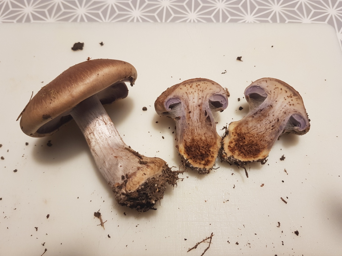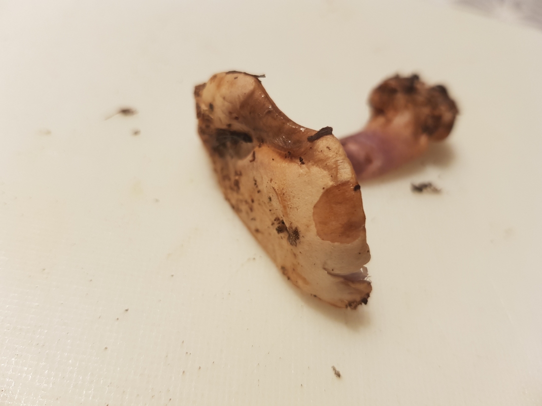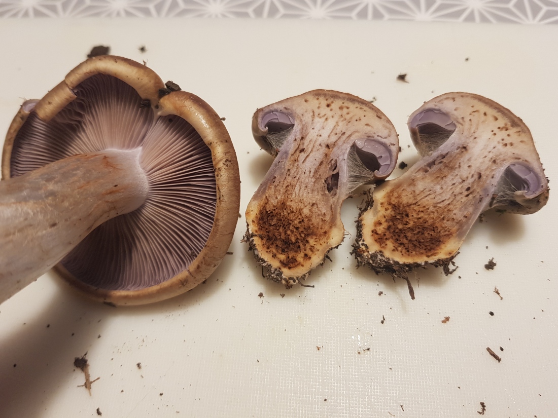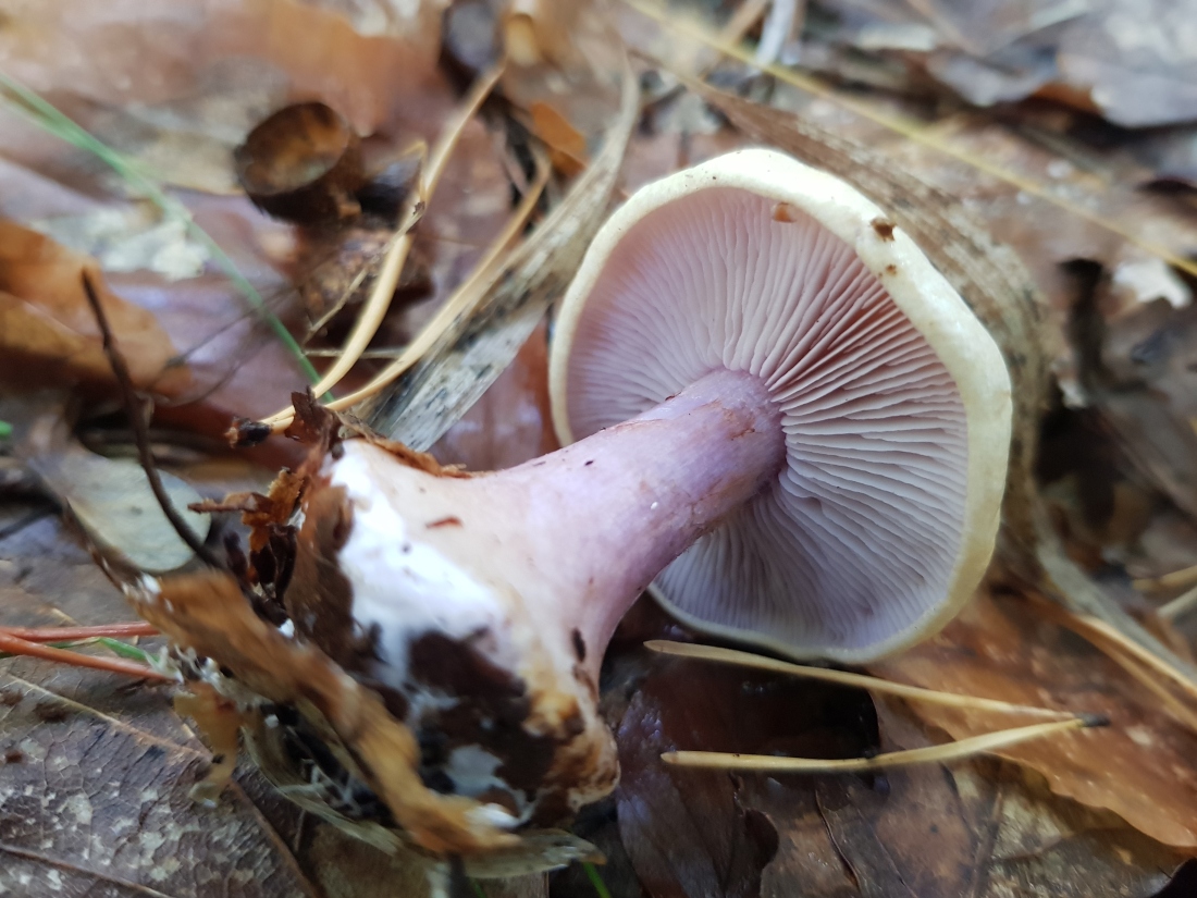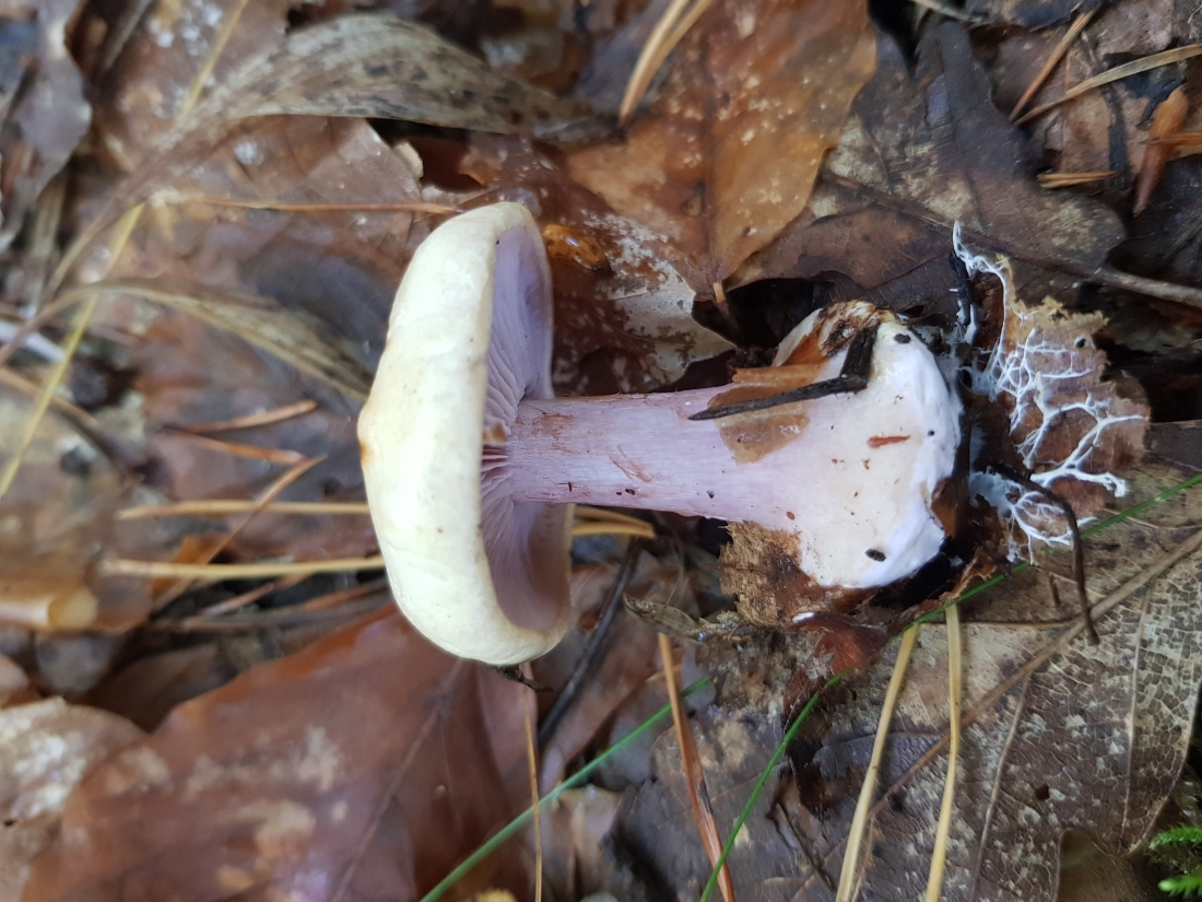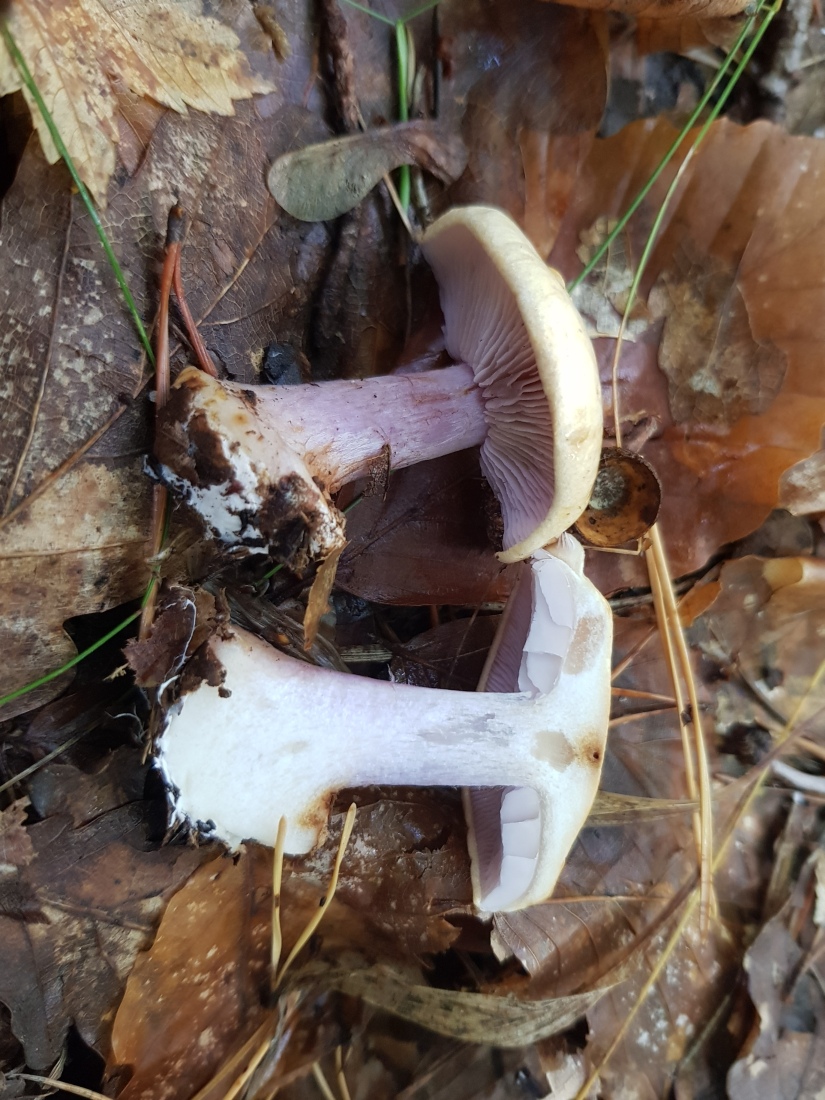 Fund im Laubmischwald bei Hainbuchen, Eiche und Elsbeere auf Kalk. Lamellen lila. Ich dachte zunächst er könnte identisch mit Fund 3 sein, aber der Hut ist scheint heller und der Stiel auffällig lila. Stielfleisch lilalich. Geruch schwach fruchtig, keinesfalls muffig.