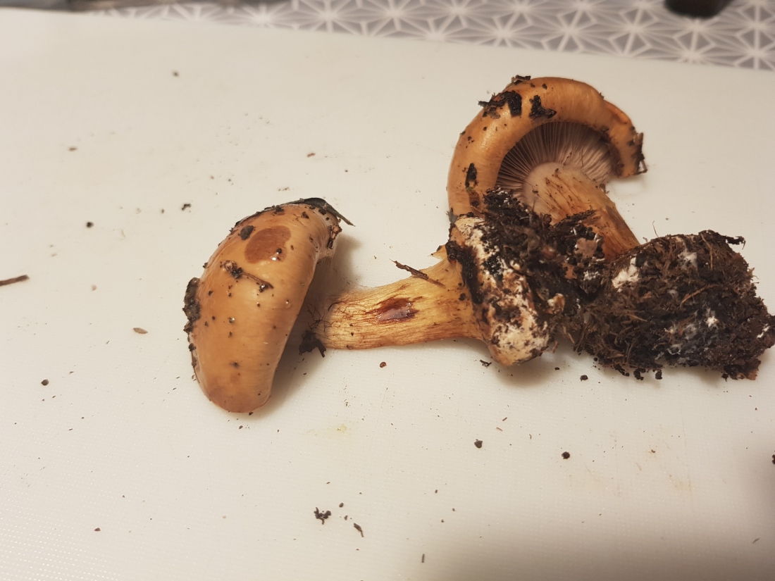 Ich habe mal meine Funde mit KOH tracktiert. Dabei sei noch erwähnt, dass die Fruchtkörper nun bereits seit zwei Tagen im Kühlschrank abgedeckt in einer Schüssel lagen. Augenscheinlich waren sie nicht ganz passabel und die Hüte teils noch schleimig, aber ev. verfälscht das dennoch bereits die eine oder andere KOH Reaktion?