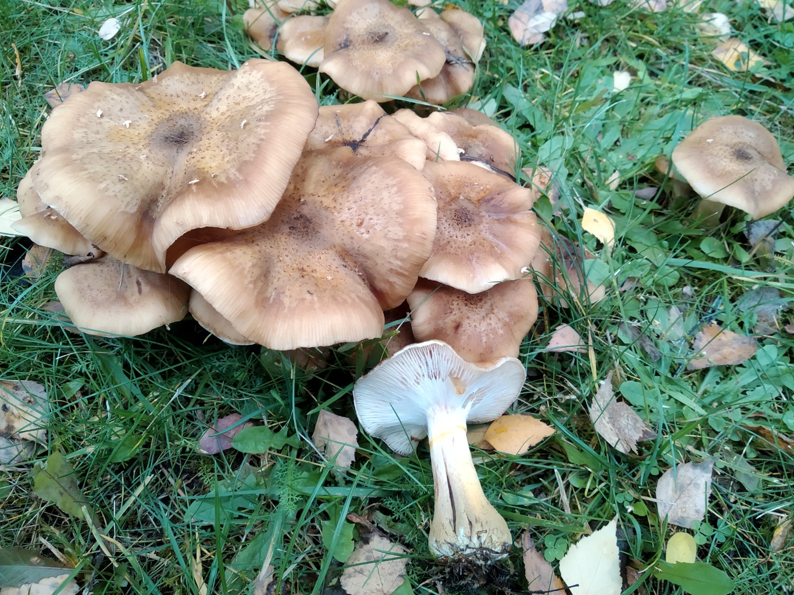 • Danke für die Einschätzung :) ! Sehr überraschend für mich, muss ich sagen... Bei dem Hut hatte ich auch zuerst an einen Hallimasch gedacht, aber beim Stiel bin ich davon wieder abgerückt. Schüppchen habe ich da keine gesehen, auch keine Manschette, nur diesen gelben Ring. Auf der Wiese müsste dann auch einiges an Totholz vergraben sein, denn alle Pilze standen büschelig im Gras.