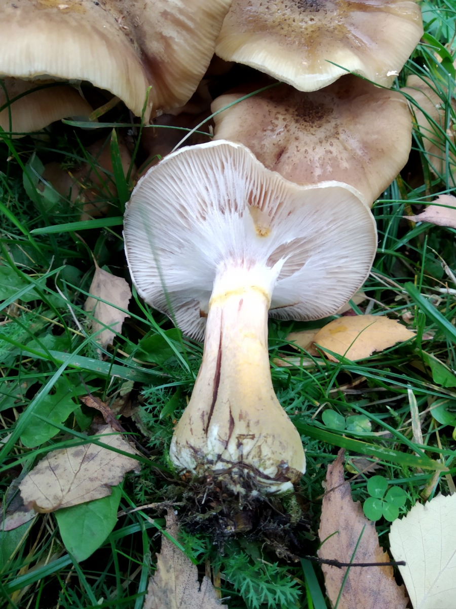 • Danke für die Einschätzung :) ! Sehr überraschend für mich, muss ich sagen... Bei dem Hut hatte ich auch zuerst an einen Hallimasch gedacht, aber beim Stiel bin ich davon wieder abgerückt. Schüppchen habe ich da keine gesehen, auch keine Manschette, nur diesen gelben Ring. Auf der Wiese müsste dann auch einiges an Totholz vergraben sein, denn alle Pilze standen büschelig im Gras.