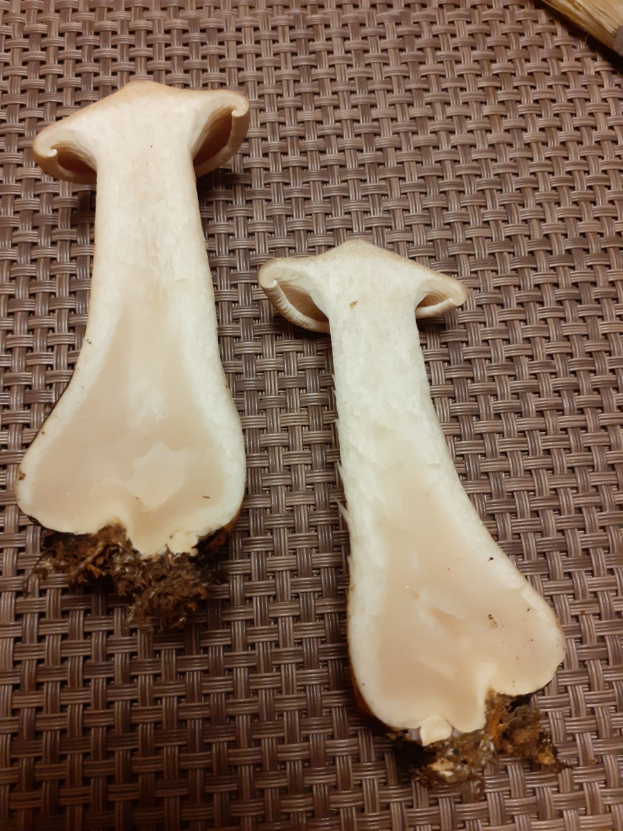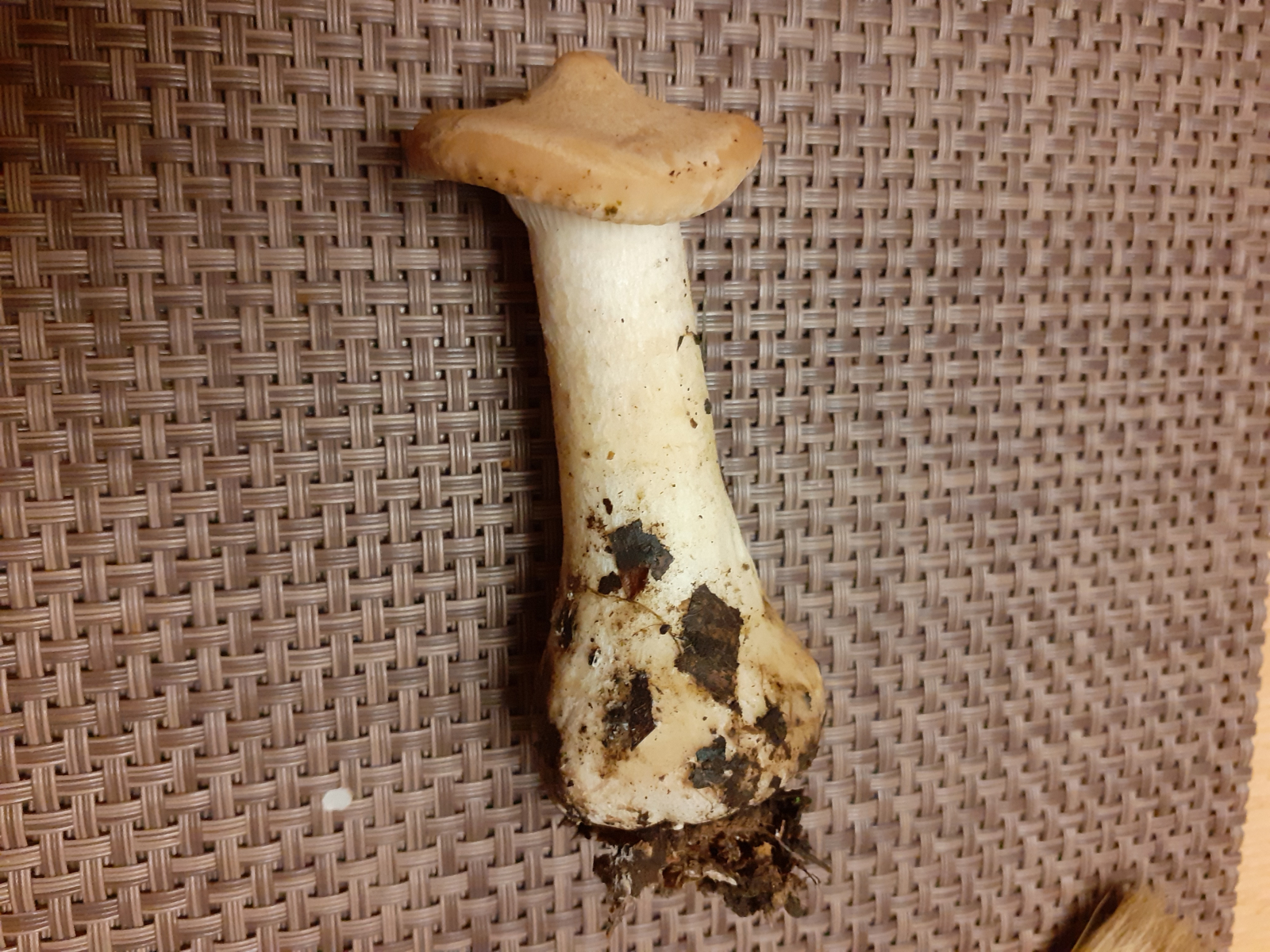 Die Stielbasis läuft unten knollig aus und der Hut war im Wald fast weiß und zuhause deutlich beigefarben