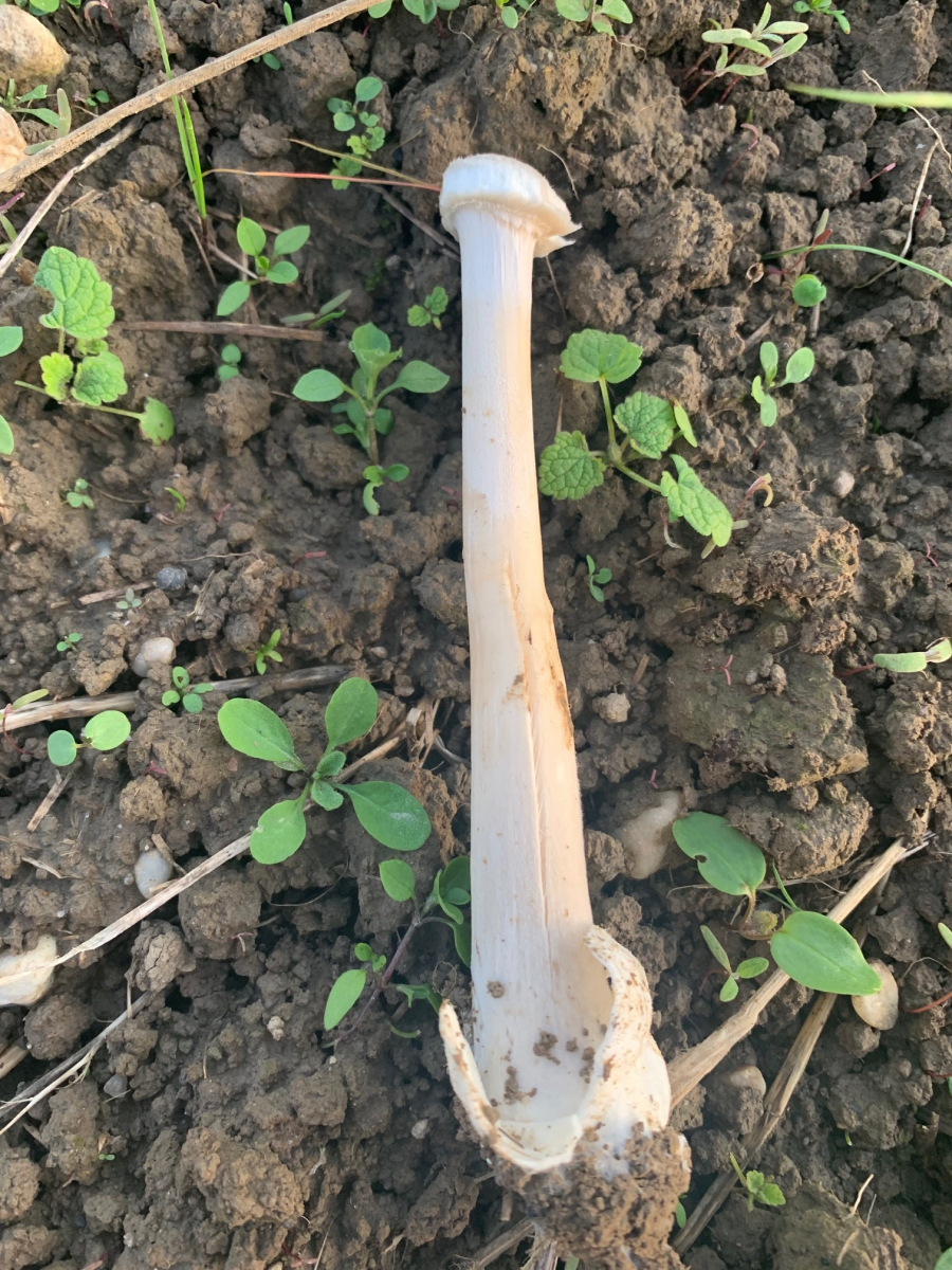 Groß in jeder Hinsicht - Stiel ca. 15 cm bei den großen, Hut ca. 10 cm, hat eine weiße Volva, ist am Hut von weiß-grau bis grau-grau. Je nach Alter. Stiel fasert stark und riecht nach "Spargel" - echt jetzt ! "Rettich" eher für Unbedarfte - die älteren sind ein bisschen aasig unangenehm, die Lamellen locker, sehr feucht vom Regen, ein imposanter Pilz. Die Oberfläche des Hutes ist ein bisschen filzig, und falls jemand Krümel sieht, das ist Erde. Der kommt frisch aus dem biologisch bearbeitetem Feld. (So eine Walze mit Zacken) .Sporenfarbe nicht ermittelt, Geschmack - nein danke. Der ganze Pilz im Bild, ist der Älteste, und der am wenigsten appetitlich riecht. Sonst ein Pilz, den ich in einer Hungersnot durchaus in die Pfanne hauen würde.