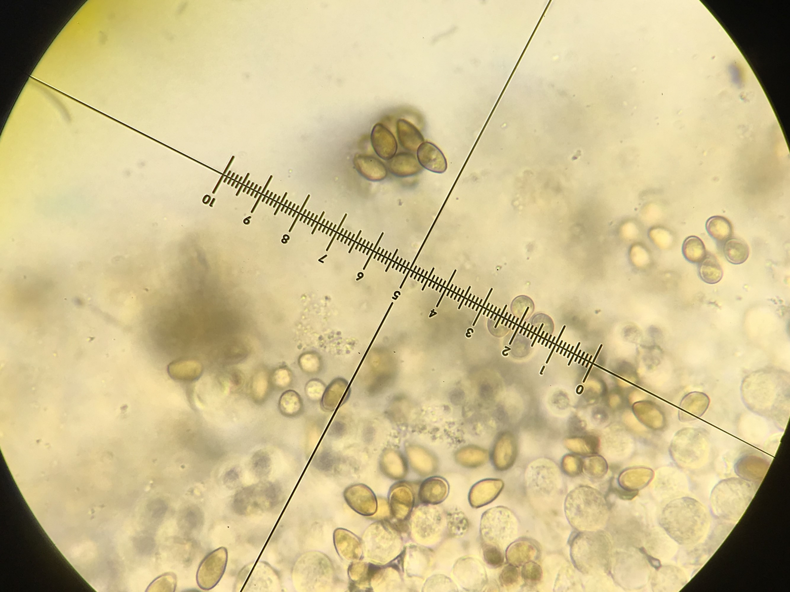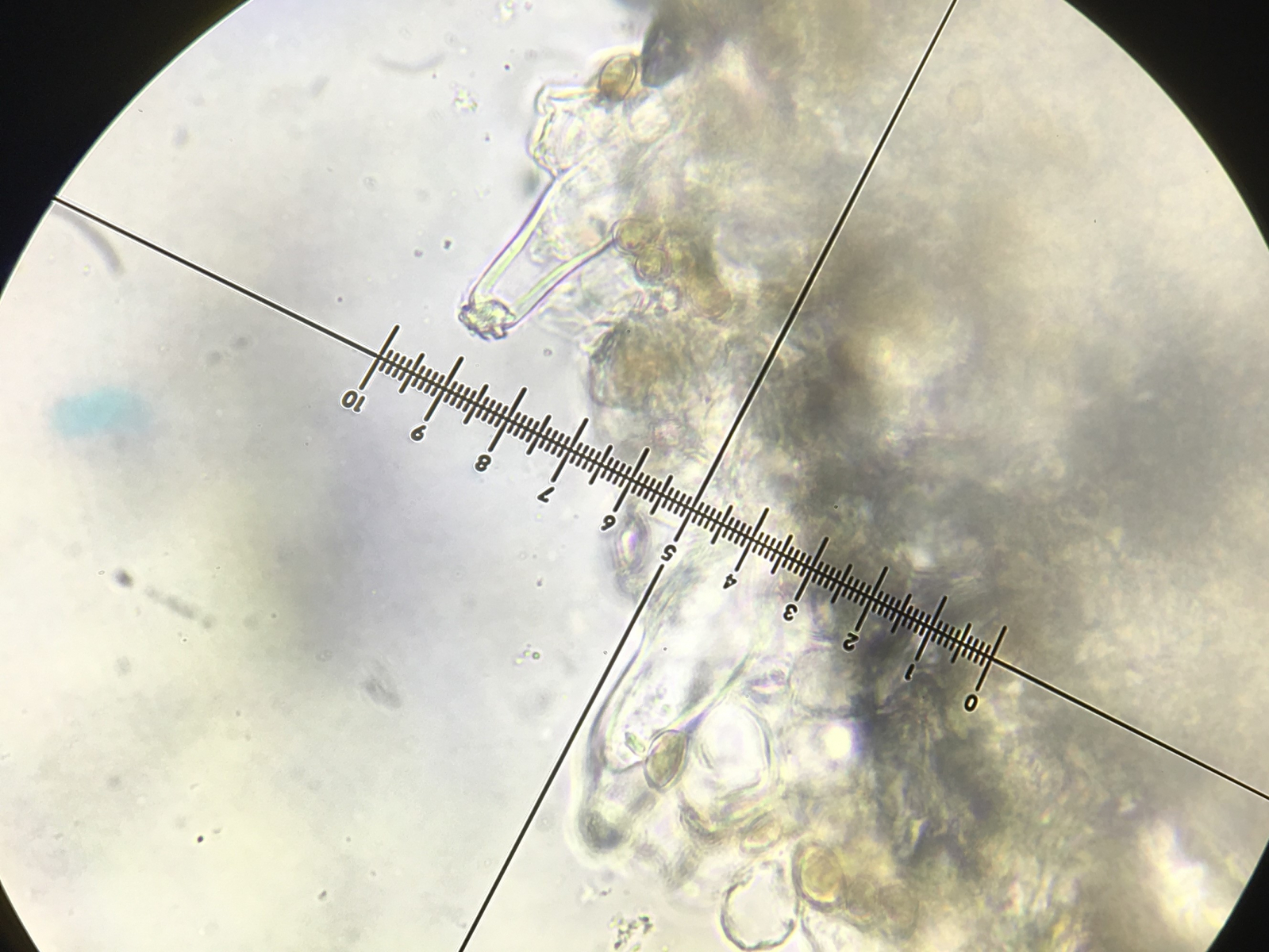 Sporen glatt, Cheilozystiden dickwandig mit Kristallschopf, Basiden viersporig