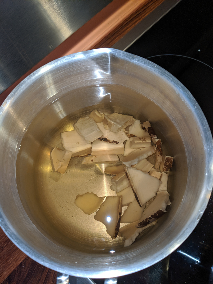 Rezept: ein Fingenagel-großes Stück getrockneter Birkenporling in 150 ml Wasser aufkochen und dann 20 Min köcheln lassen. Auffüllen mit heißem Wasser auf eine Tasse.