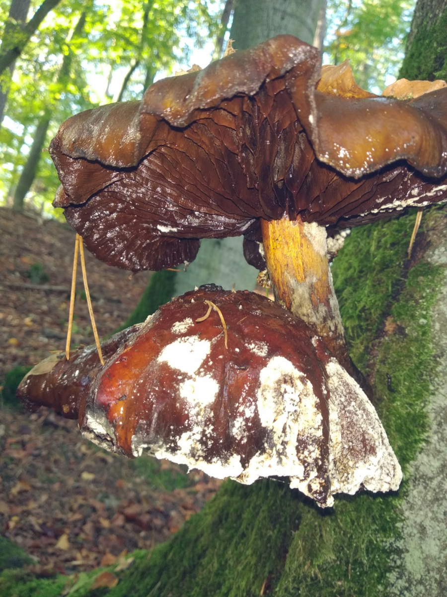 3. Goldfell-Schüppling? Büschelig am Stirnholz eines liegenden Buchenstamms, Hut schmierig, Stiel ganz leicht klebrig.