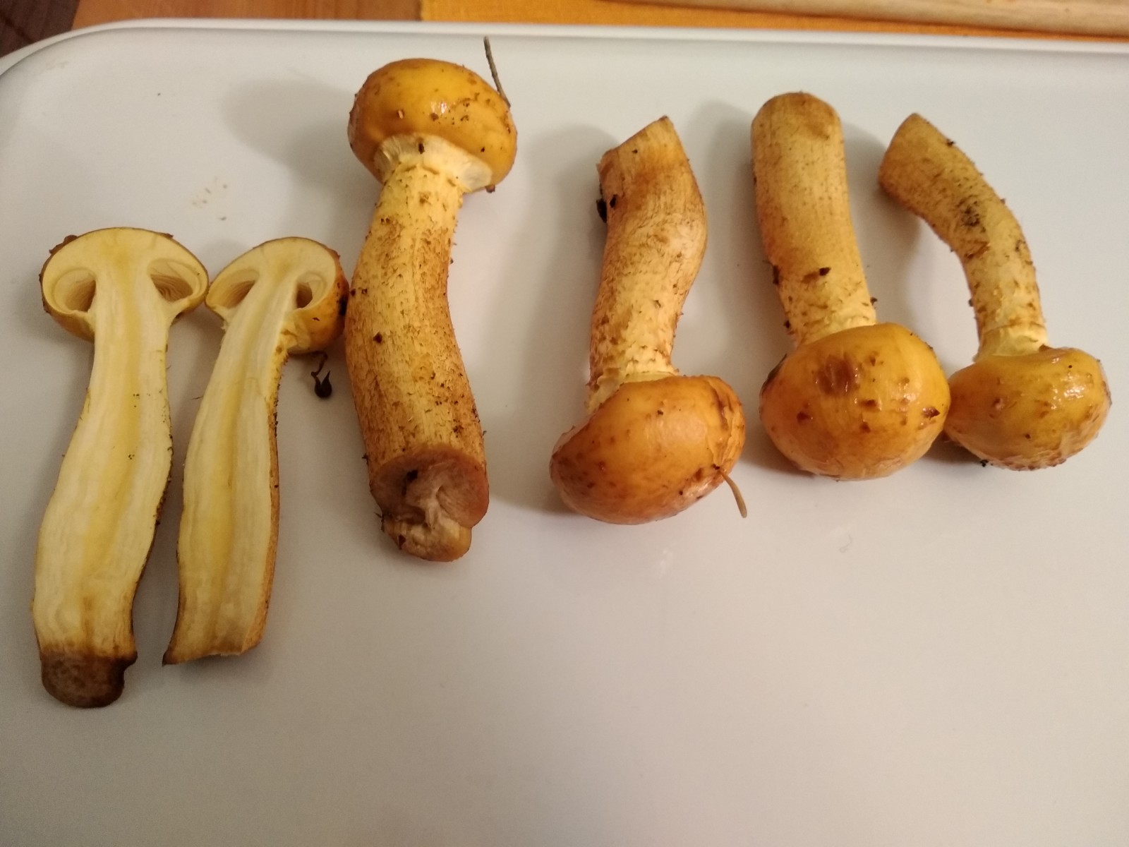 ich war heute morgen ein wenig im Laubwald unterwegs, sauerer Boden mit vielen Buchen, stellenweise kleine Fichtenplantagen. Neben den Speisepilzen, die ich gerne für den Kochtopf mitnehme, habe ich heute auch ein paar zum Kennenlernen eingepackt. Bei einigen bin ich mir sehr sicher, bei anderen nicht. Leider habe ich gerade keinen Bestimmungsschlüssel zur Hand, sodass ich bei einzelnen überhaupt keine Idee hatte. Euch wäre ich sehr dankbar, wenn ihr was zu meinen Vermutungen und Angaben sagen könntet! ![]()