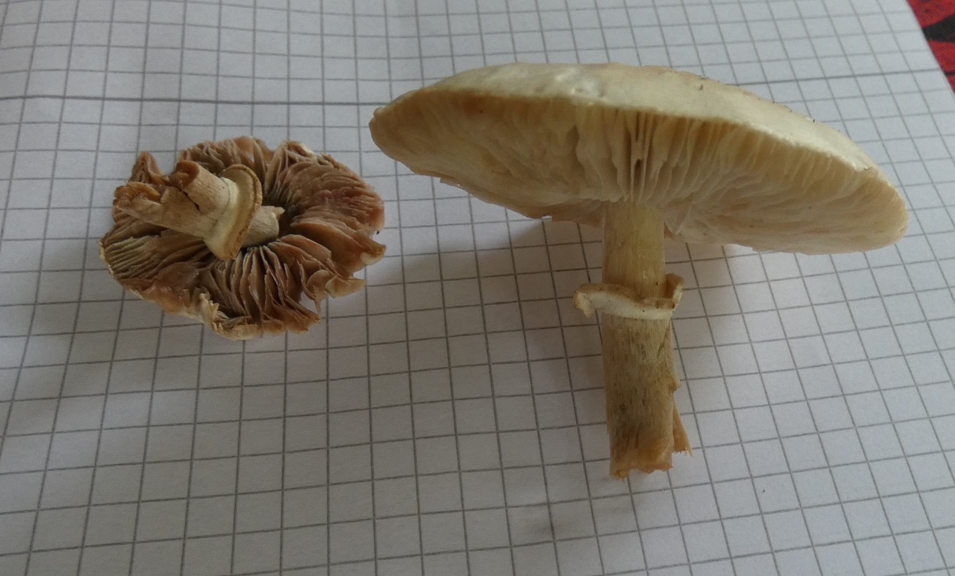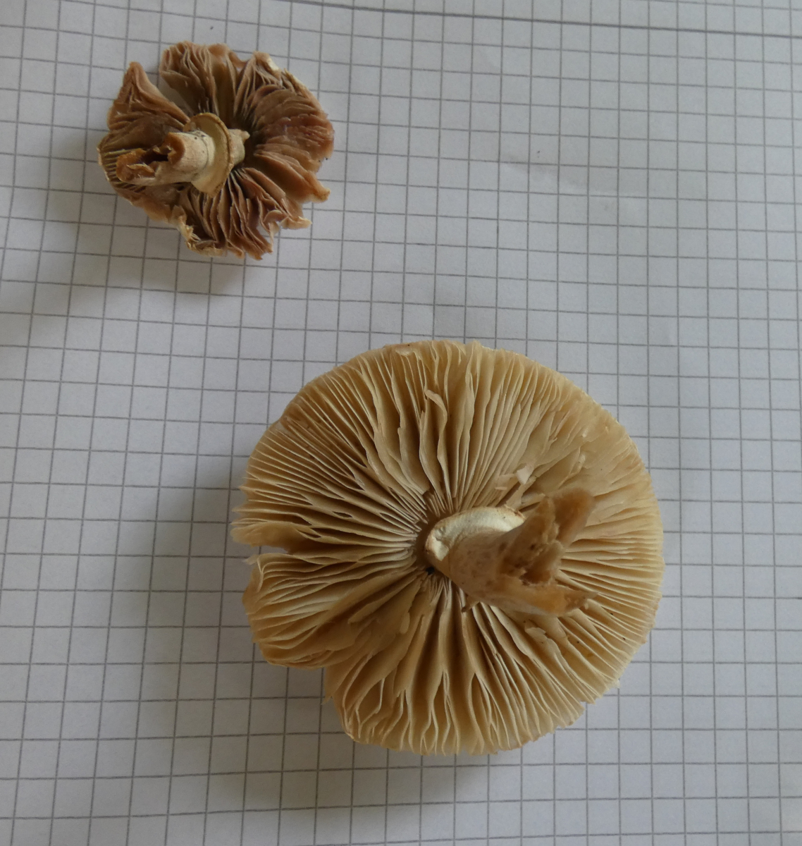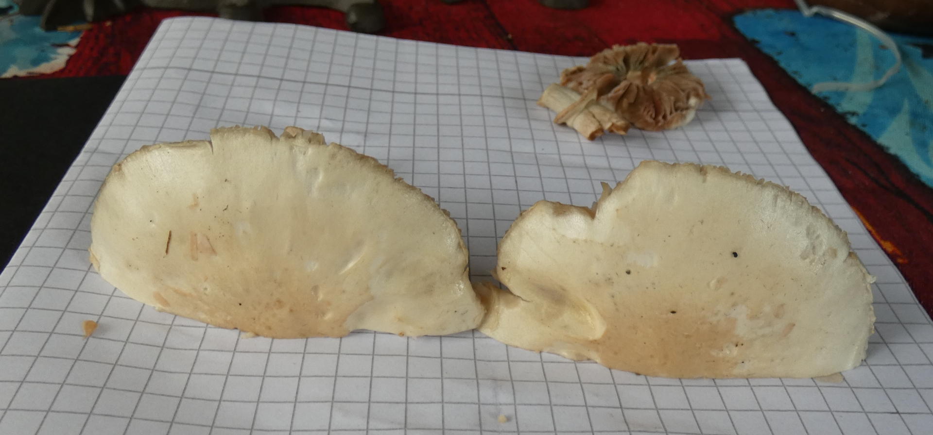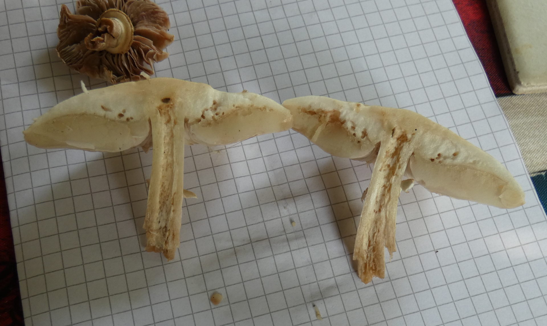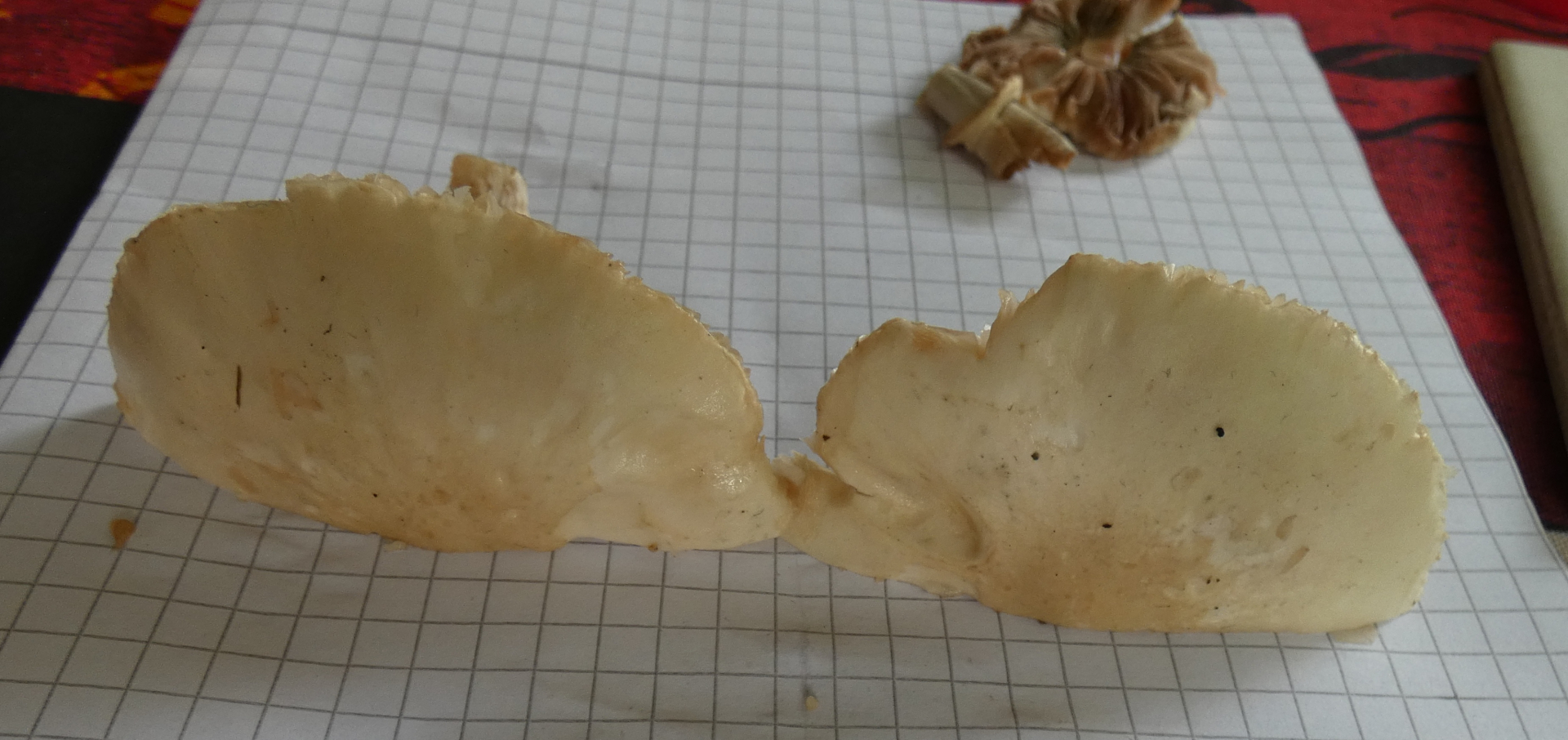 ANSCHNITT: Lamellen jung weiĂlich-hellbeige, älter dunkelbeige-braun, Fleisch weiĂlich, zur Hutmitte hin leicht beige, Mitte etwas wattig