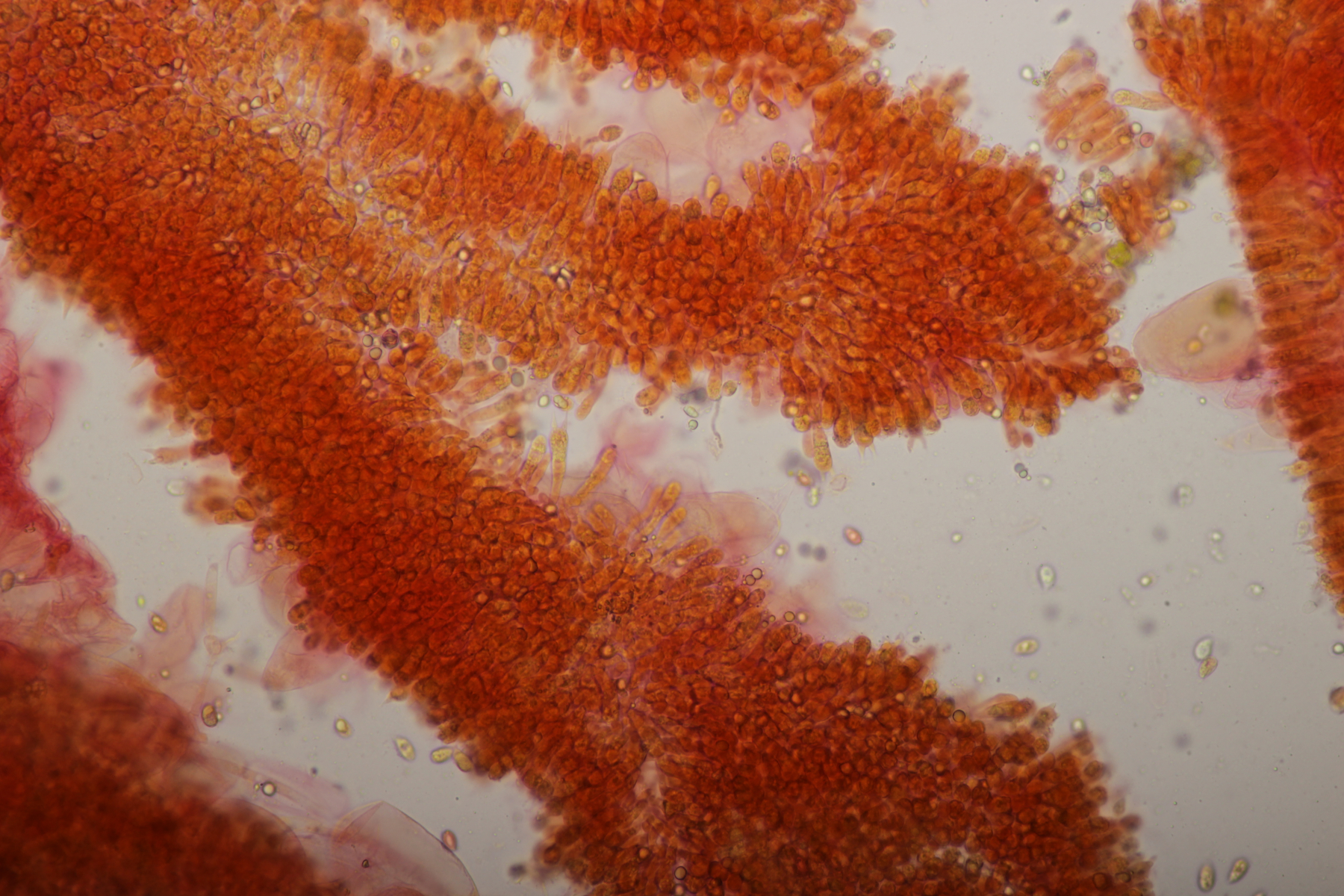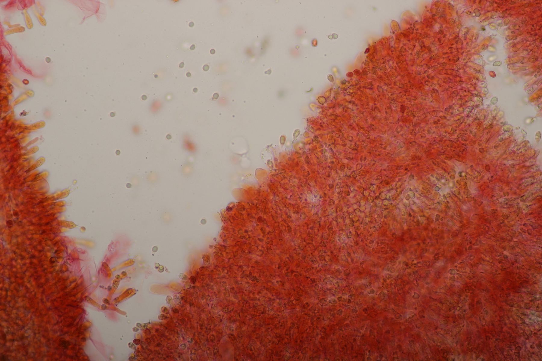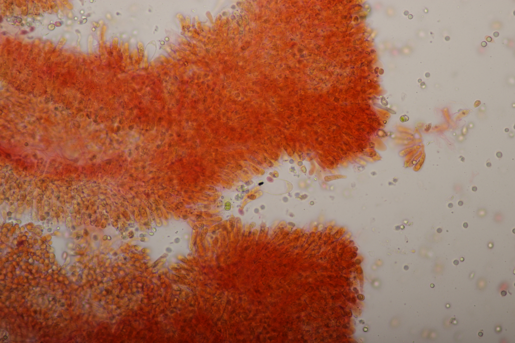 Auch deren Sporen sind im Durchschnitt mit 9 x 7,8 µm (eigene Messung) grösser. Deine Sporen passen zum Fund, auch die schwache Ornamentierung der nicht gerade hohen Warzen. Leider sehe ich auf deinen Mikros der Hh durch den vermutlich hohen Quetschungs-Faktor nicht das, was ich eigentlich für R. graveolens nachweisen wollte, sondern nur einzelne Fragmente der Zystiden, schade. Bestimmungsmässig bin ich mit EINHELLINGER bei R. graveolens gelandet, ob´s stimmt?