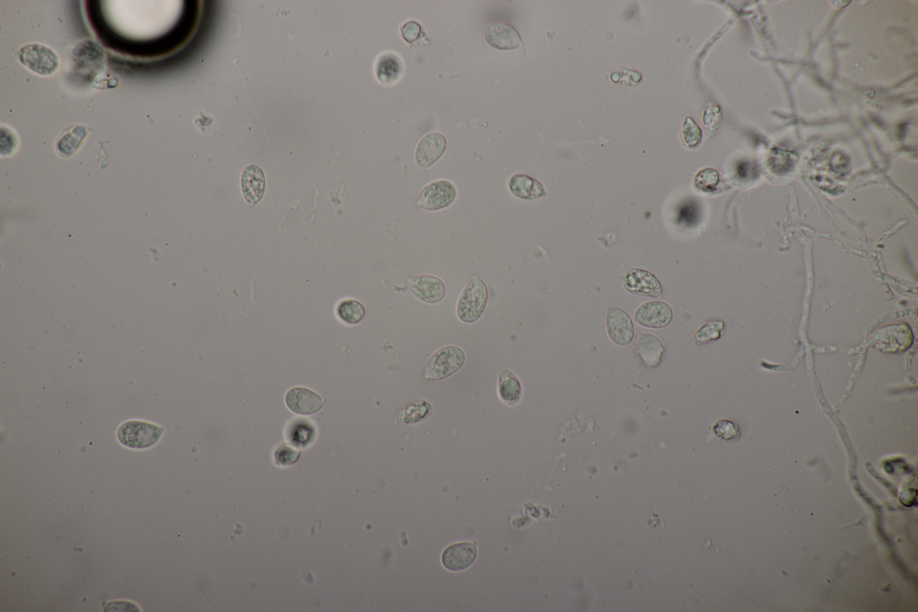 13. Mycena sp. mit deutlichem Chlorgeruch und 2-sporigen Basidien