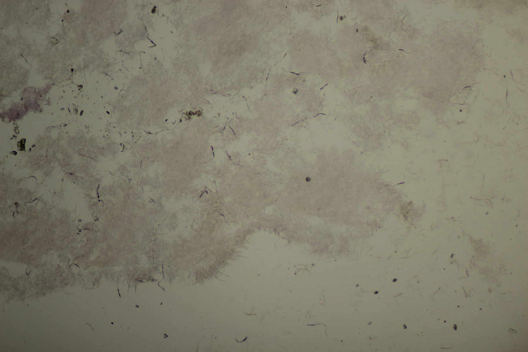 Ich arbeite mit zwei Objektträgern und schiebe das Pulver von beiden Objektträgern zu einem Häufchen zusammen