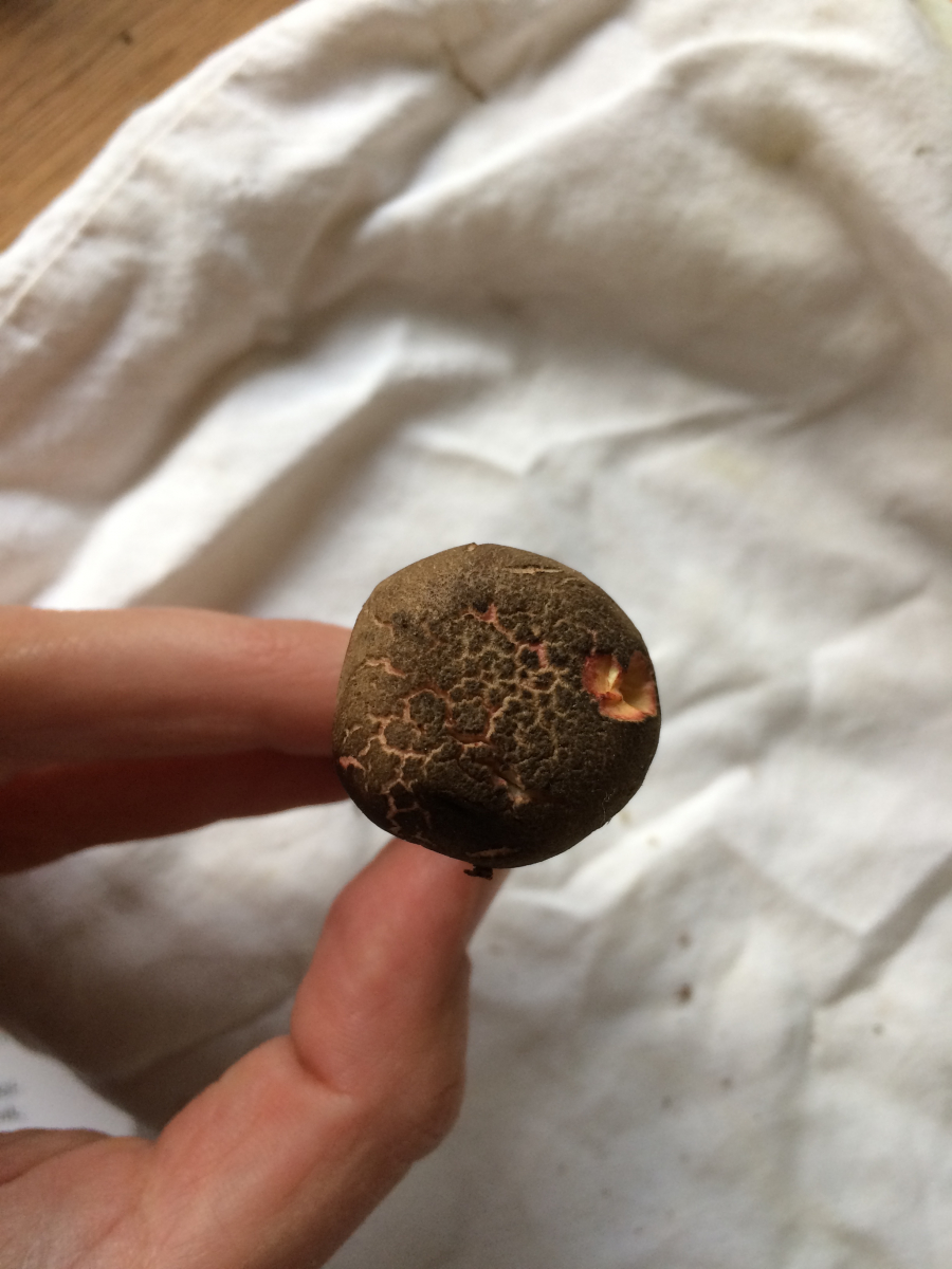 - Huthaut feldrig-rissig, darunter rötlich schimmernd, trocken, ledrig