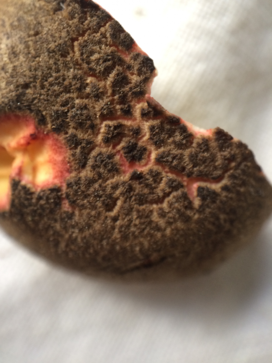 - Huthaut sehr dunkelbraun und fein samtig, rote Schicht darunter (im Anschnitt und an Fraßstellen)