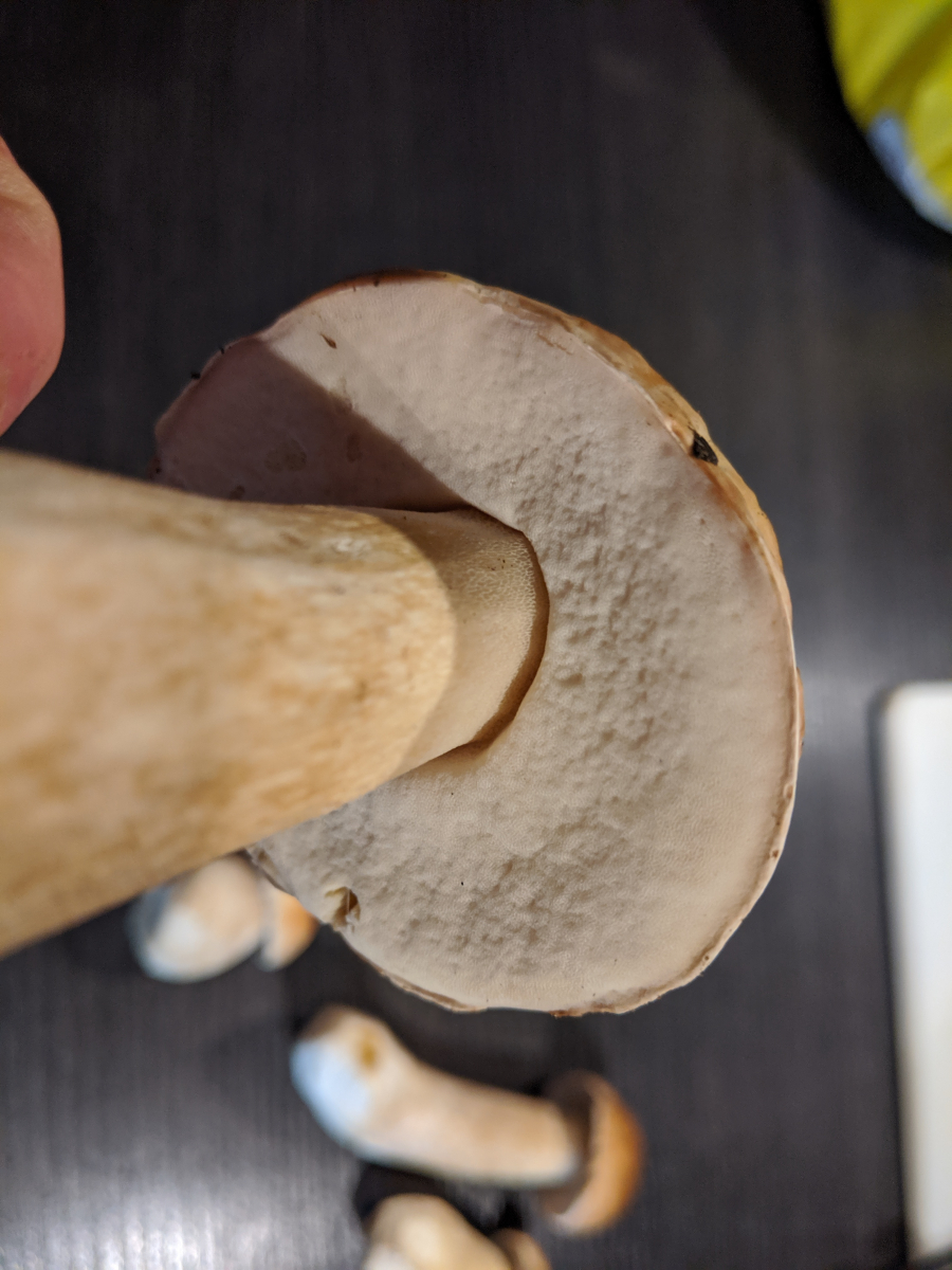 Bei den Steinpilzen finde ich kaum ein Stielnetz, bei einigen nur ganz oben in Richtung Hut (siehe Foto unten) und bei anderen eigentlich gar nicht. Aber Form, Farbe usw. passen halt...