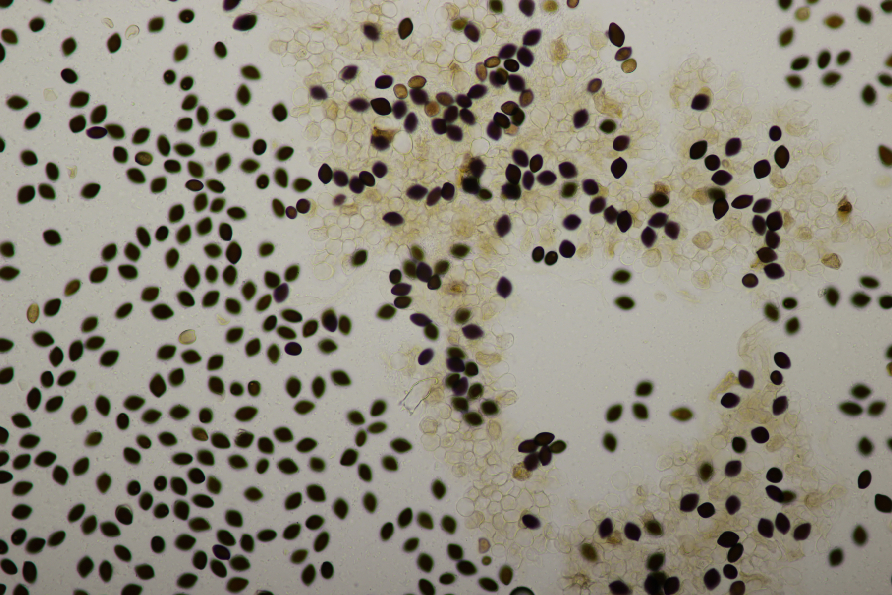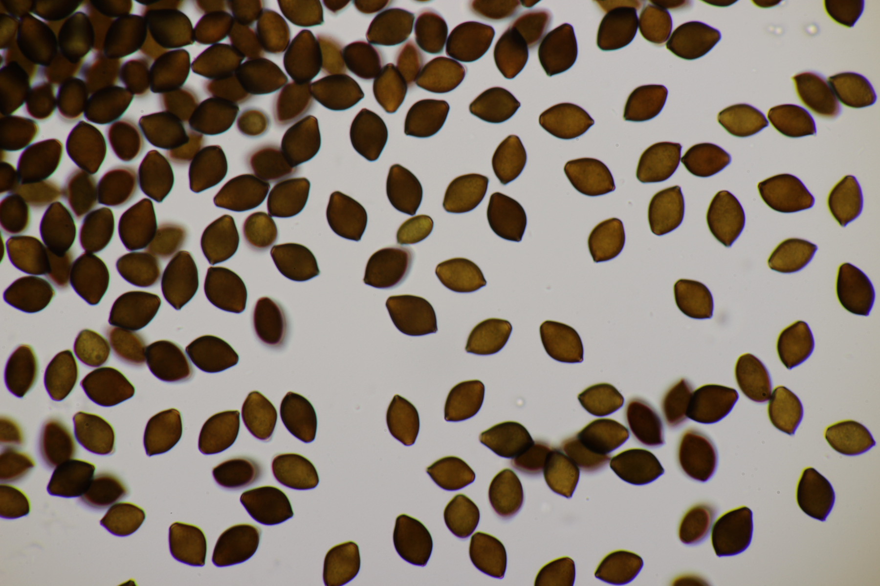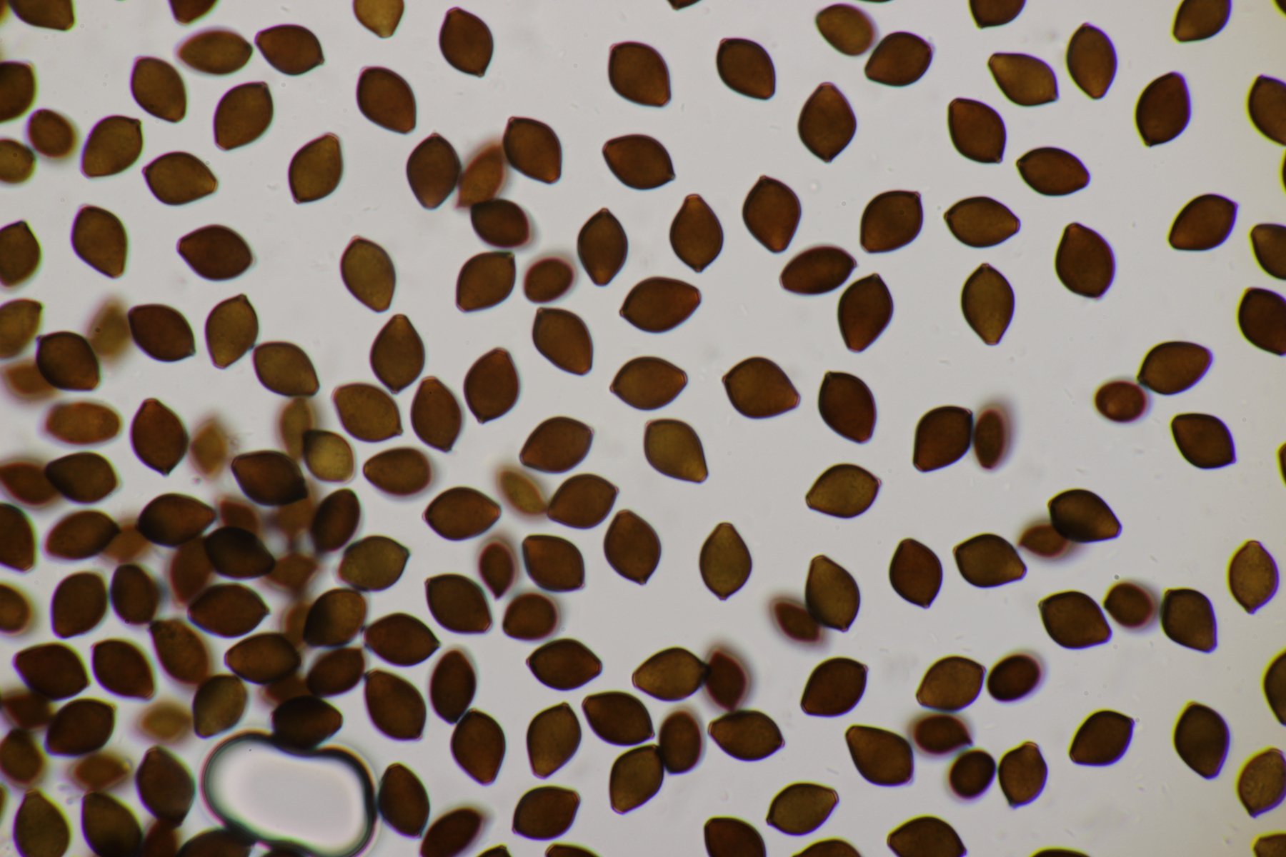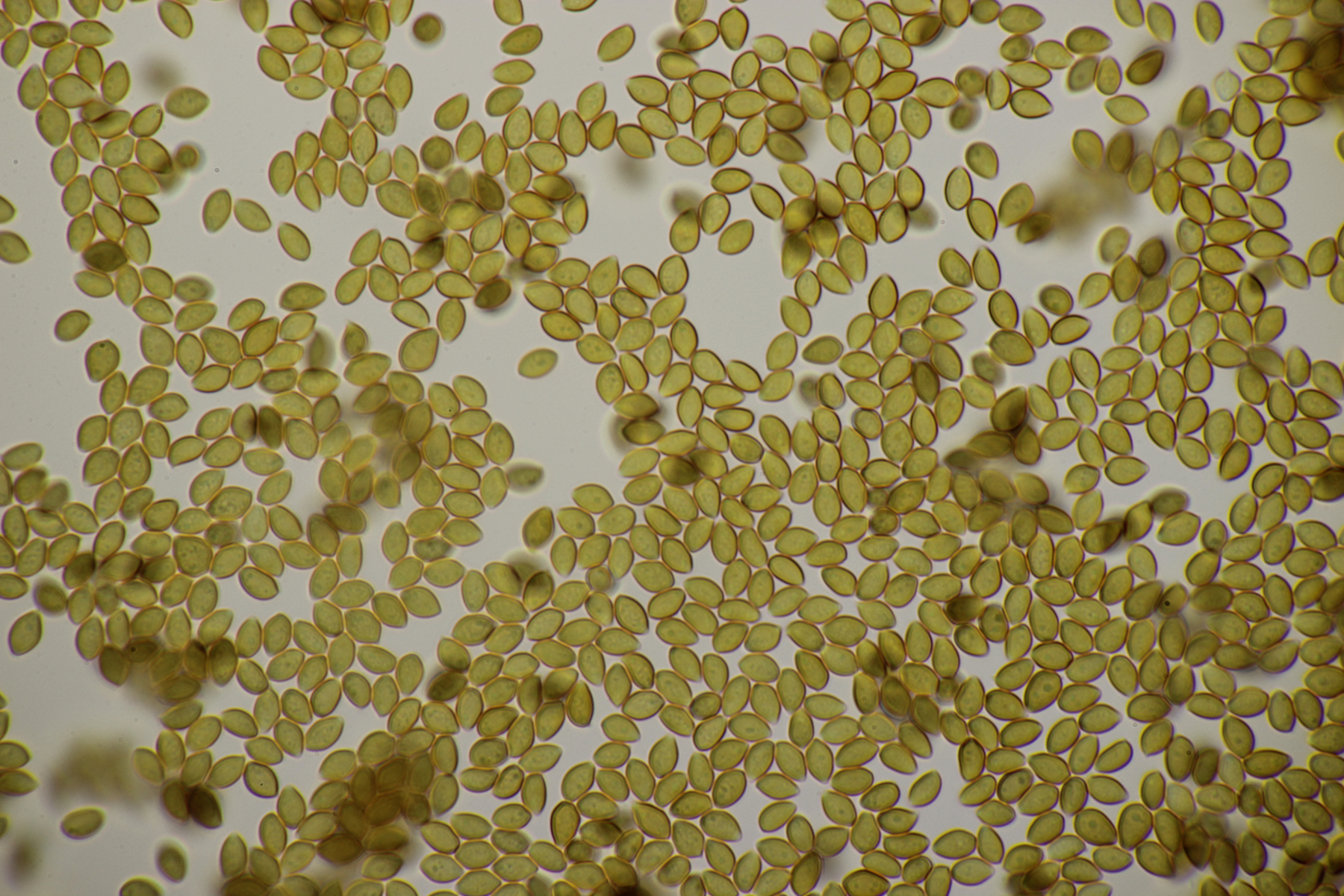 Sporen in KOH. Sporengröße (9.7+-0.5) µm x (5.1+-0.4) µm