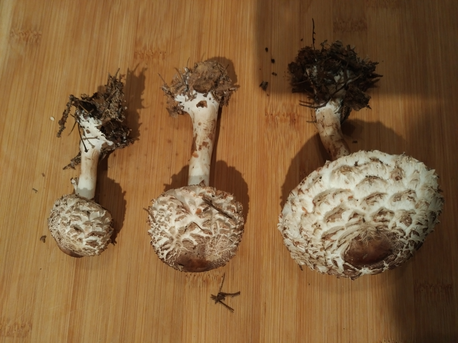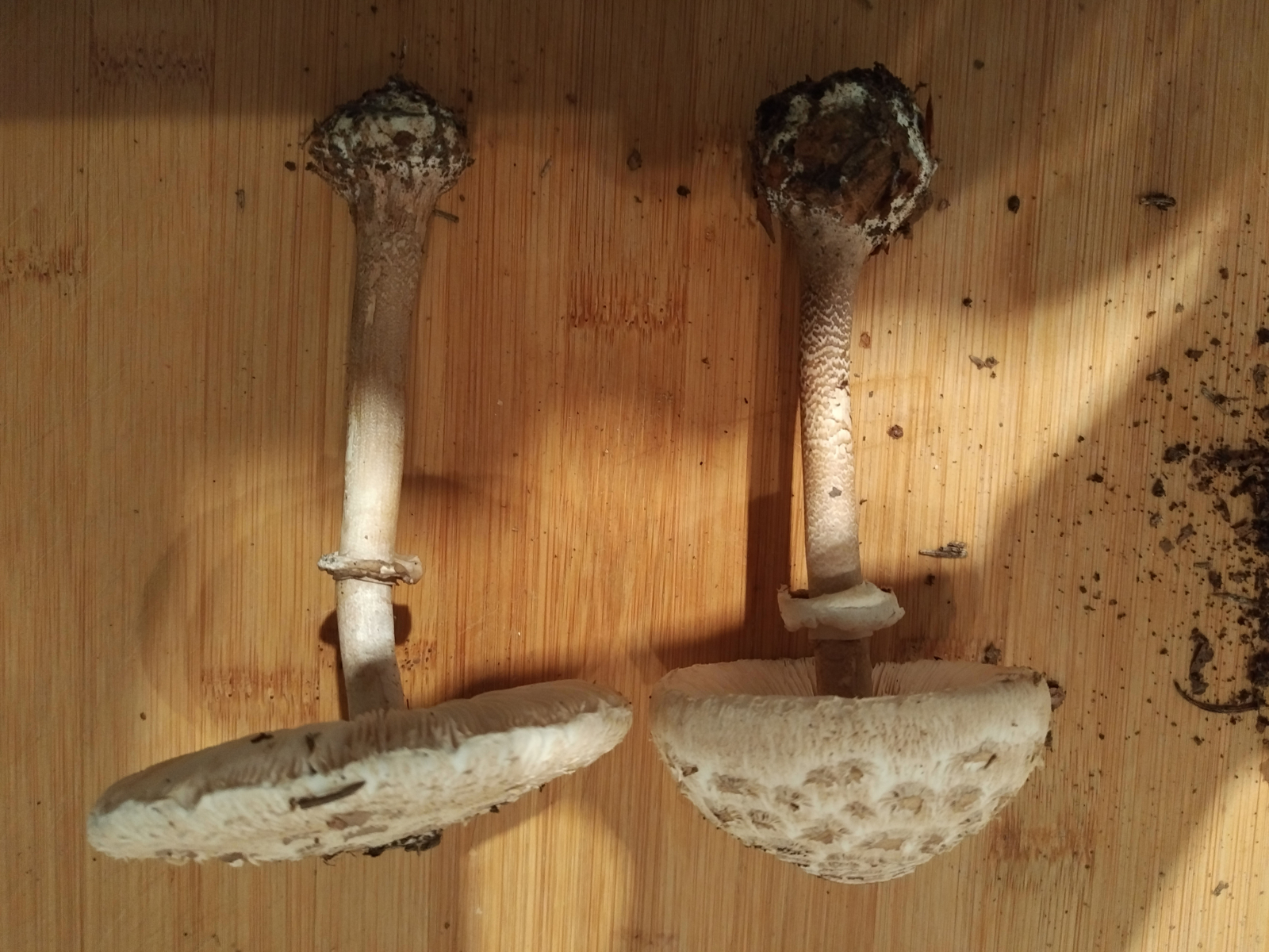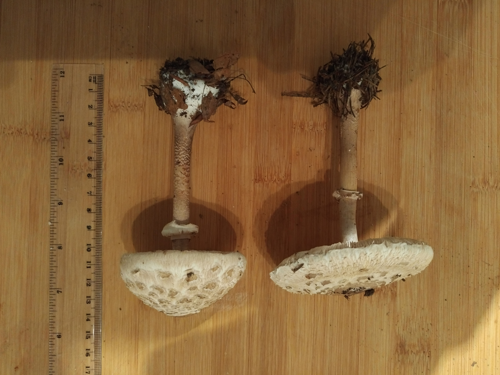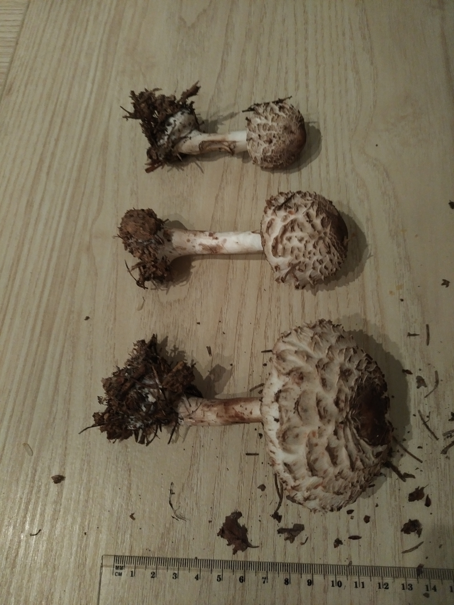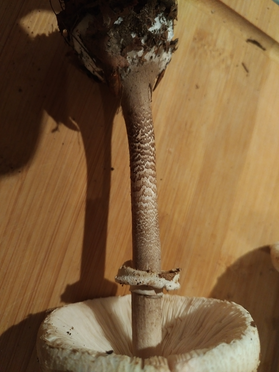 wir haben heute zwei Schirmlings- bzw. Riesenschirmlingsarten gefunden, die wir nicht genau bestimmen können. Könnt ihr uns einen Tipp geben?