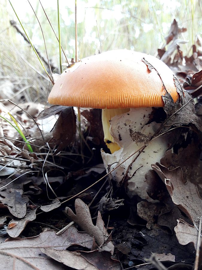 Auch aus dem Eichenwald: ein hübscher Röhrling, der unter dem Verdacht stand, Boletus (bzw. aktuell Lanmaoa) fragrans, der starkriechende Röhrling zu sein. Riecht nicht außergewöhnlich, das ist aber wohl trotz des Namens normal. Unklar ist allerdings, ob der so schnell und stark blauen darf.