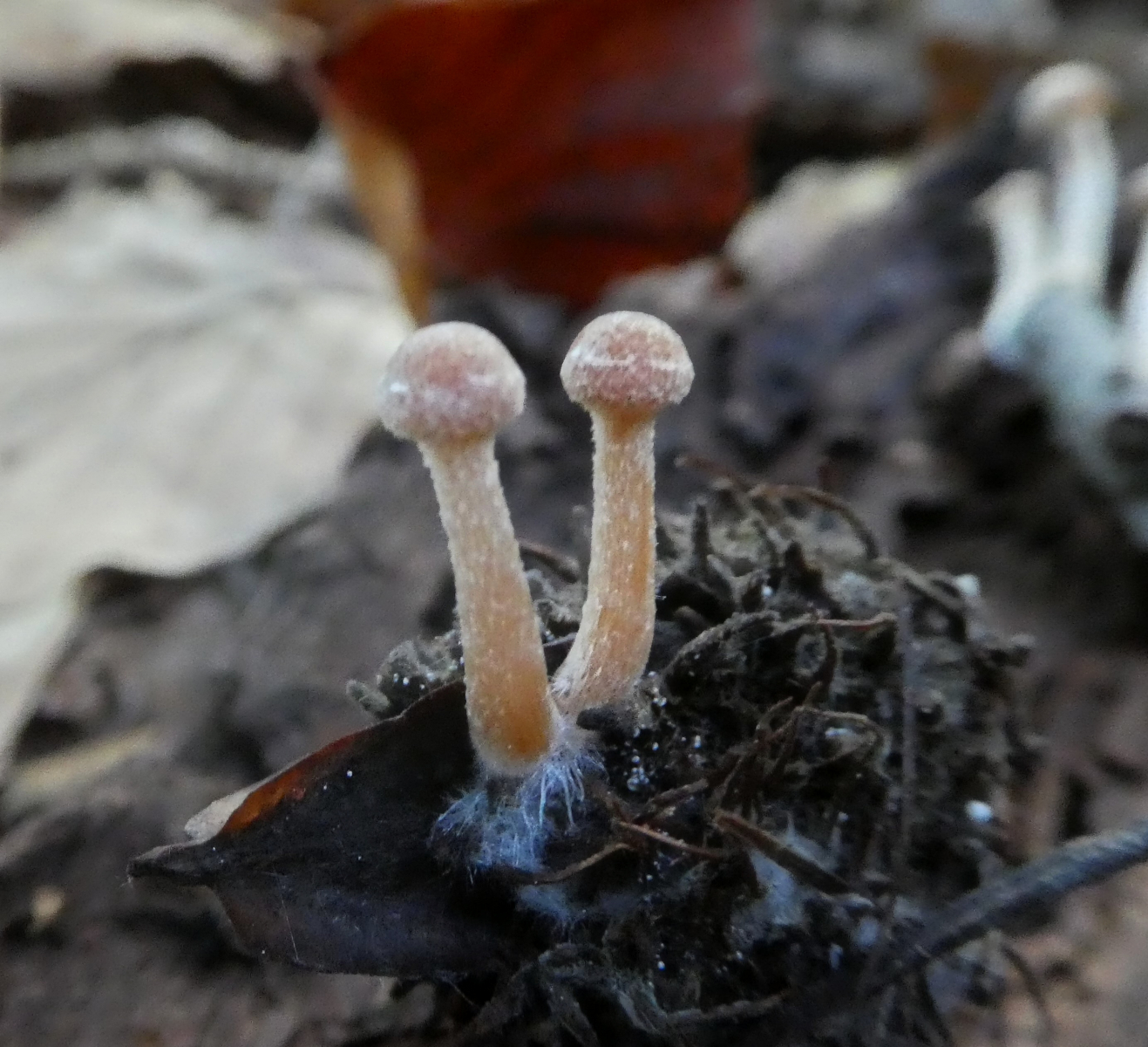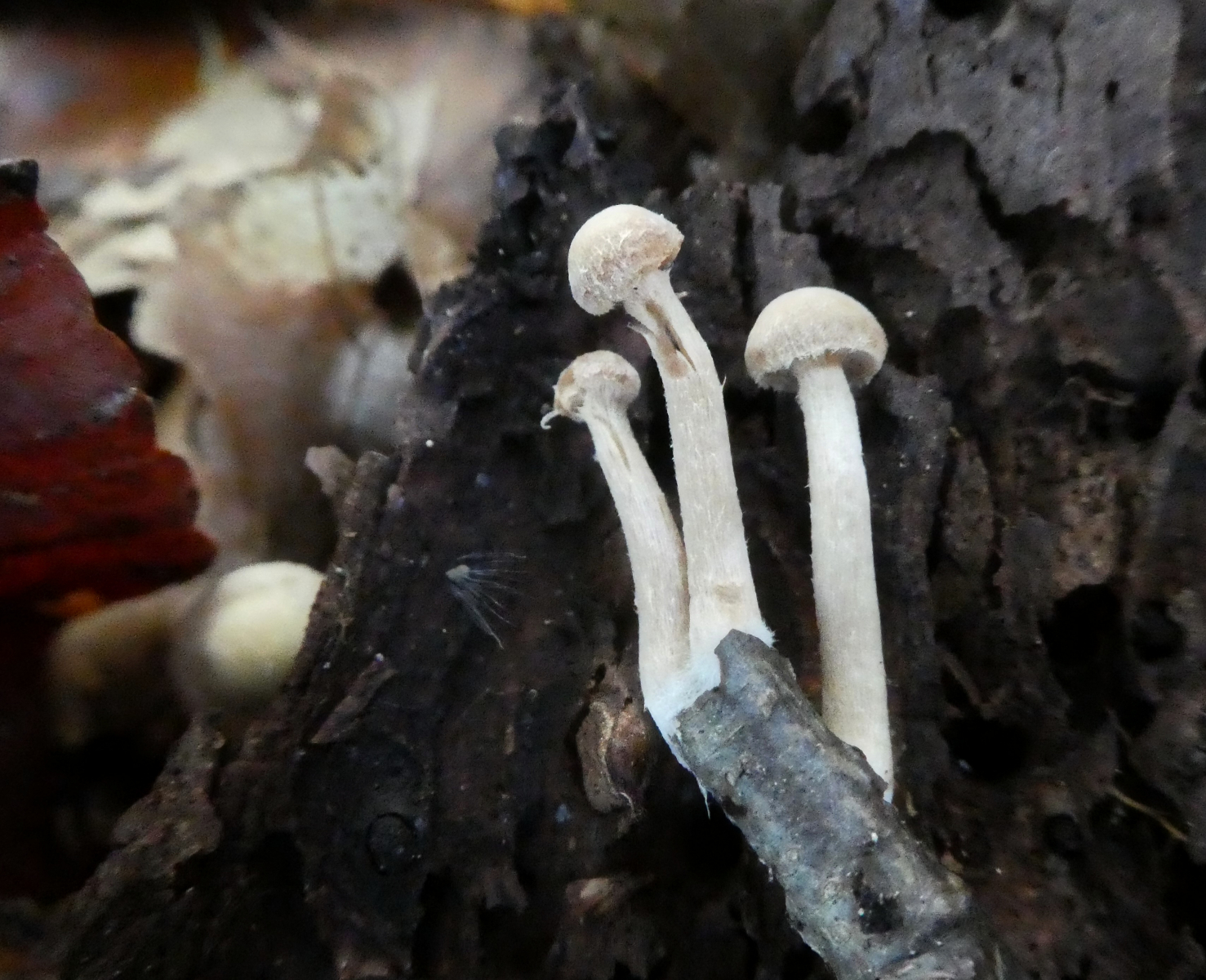 Nochmal auf Buchenästchen und leider etwas unscharf der einzige etwas ältere Pilz.