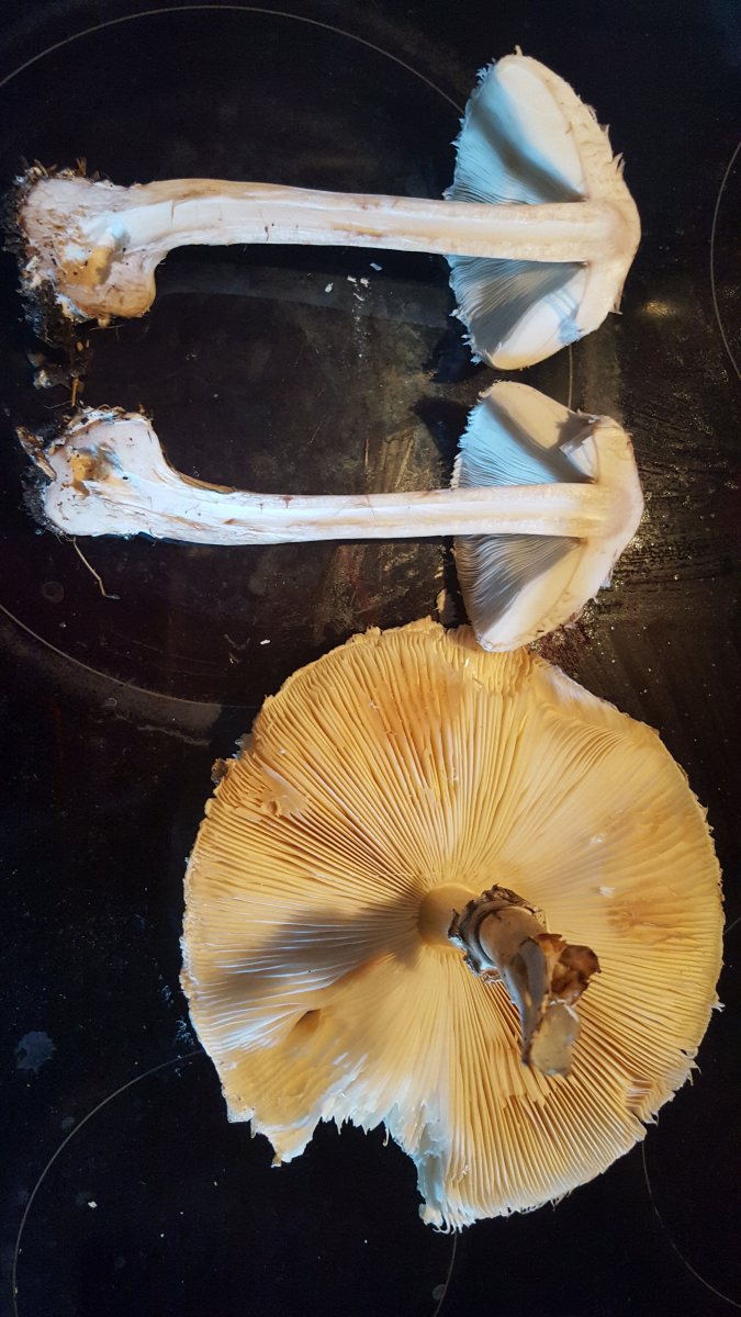 Auf einer Wiese unter einer Birke neben einer Schrebergartenanlage habe ich folgende Pilze gefunden. Ich bin mir nicht sicher, ob es sich dabei um den Gift-Safranschirmling oder den Gemeinen Safranschrimling handelt. Könnt ihr mir weiterhelfen?