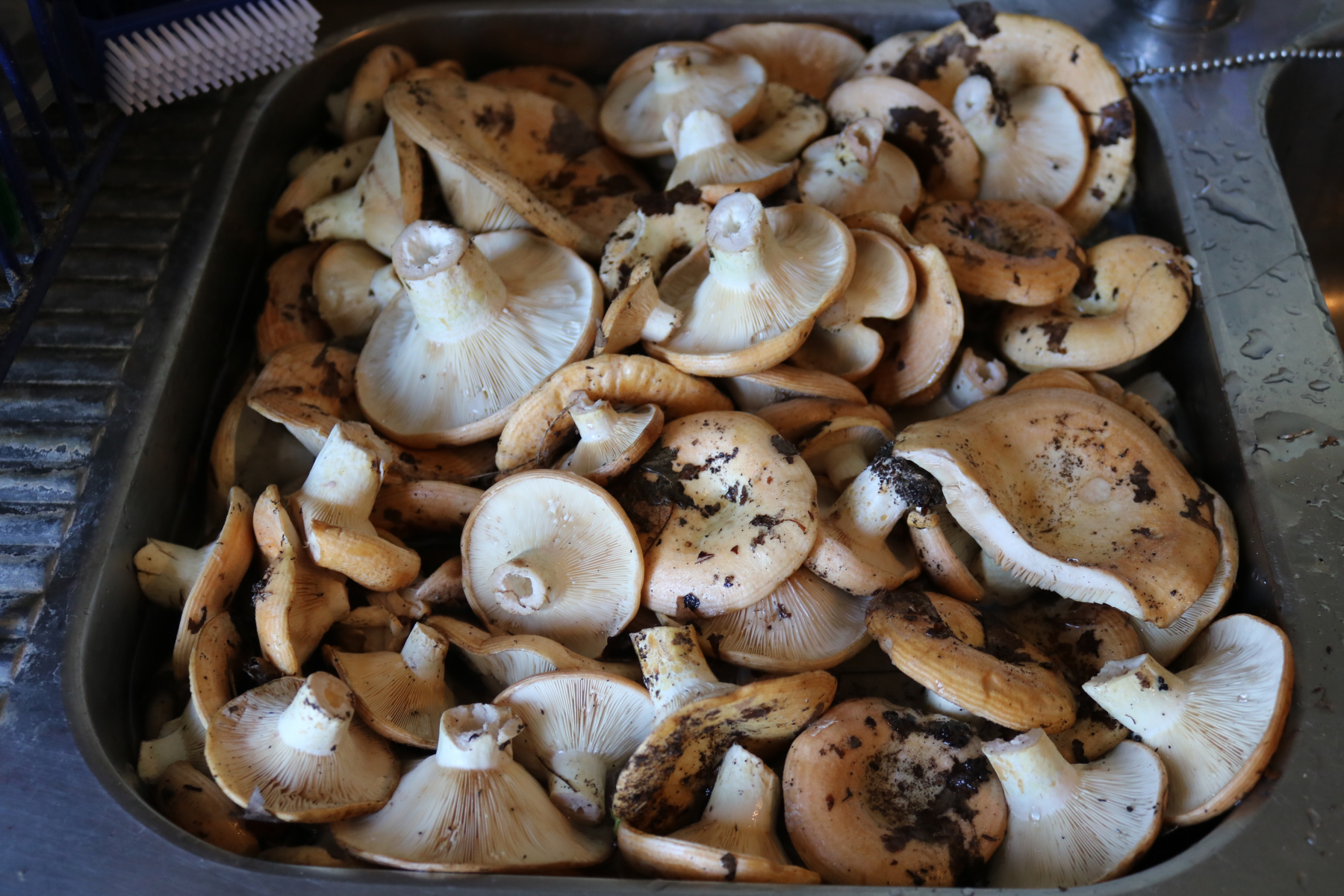 Die Pilze werden nass geputzt. Dafür kommen sie am besten gleich ins kalte Wasser, bspw. im Spülbecken, Schüssel oder Eimer zum einweichen.