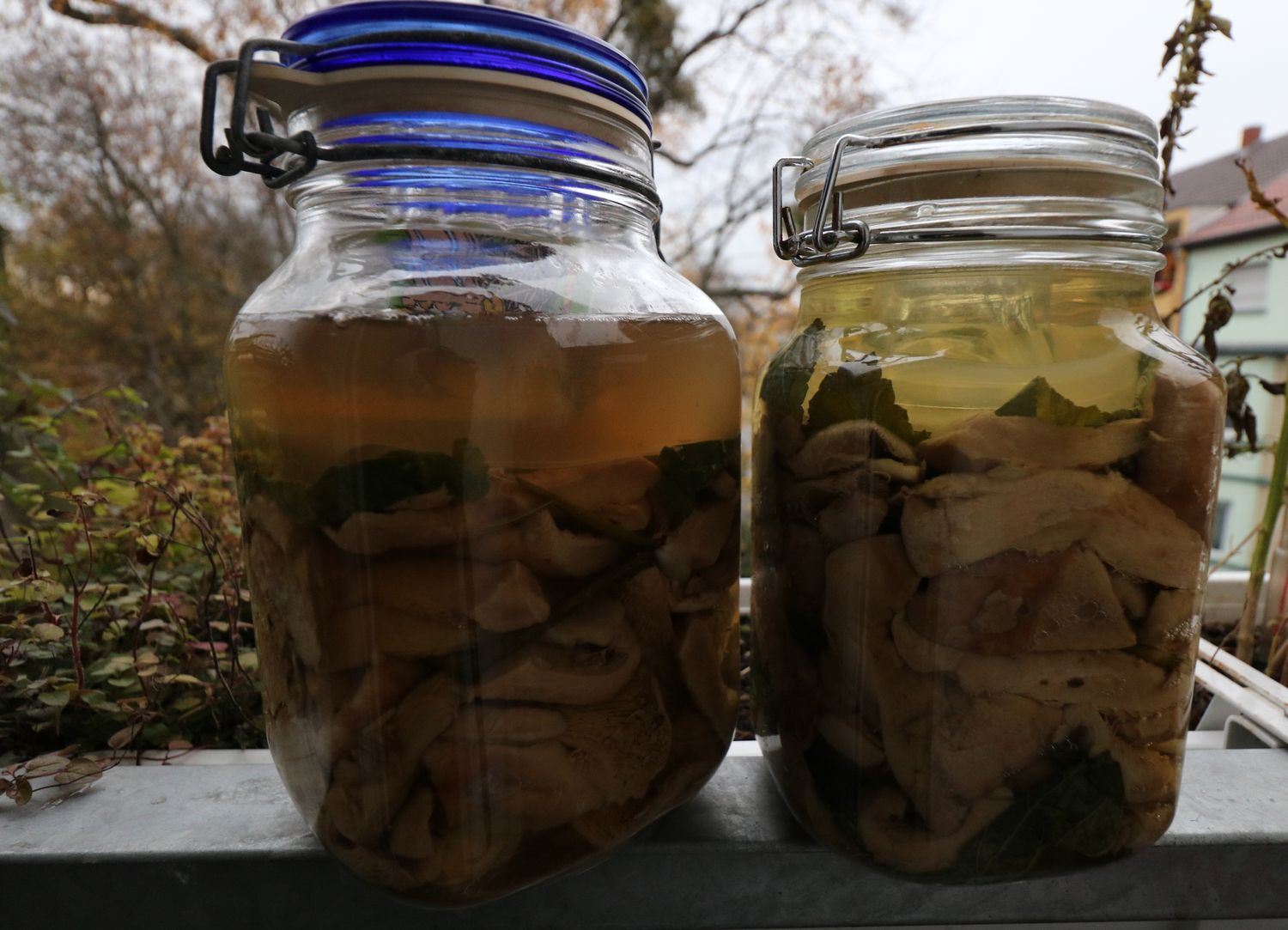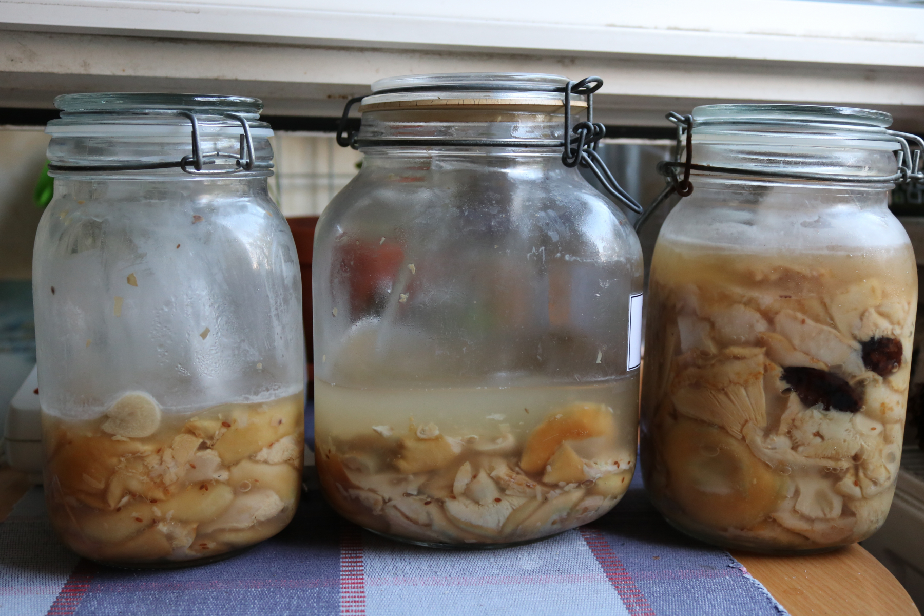 Die Pilze müssen komplett unter Salzlake sein und kein Luftkontakt haben! Genau so wie bei Sauerkraut benutzt man dafür einen Teller oder irgendeinen Deckel obendrauf und beschwert das ganze. Falls die Flüssigkeit danach nicht genug nach oben kommt, um die Pilze komplett zu bedecken, kocht man 5%-ge Salzlake zu und gibt sie einfach dazu. Dafür muss man einfach 1 Liter Wasser mit 50g Salz aufkochen und abkühlen lassen.