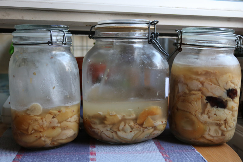 Nach vier Wochen haben wir angefangen die Pilze zu essen (und auch zu verschenken). Sechs Wochen später sind die Gläser bereits so, halb leer: