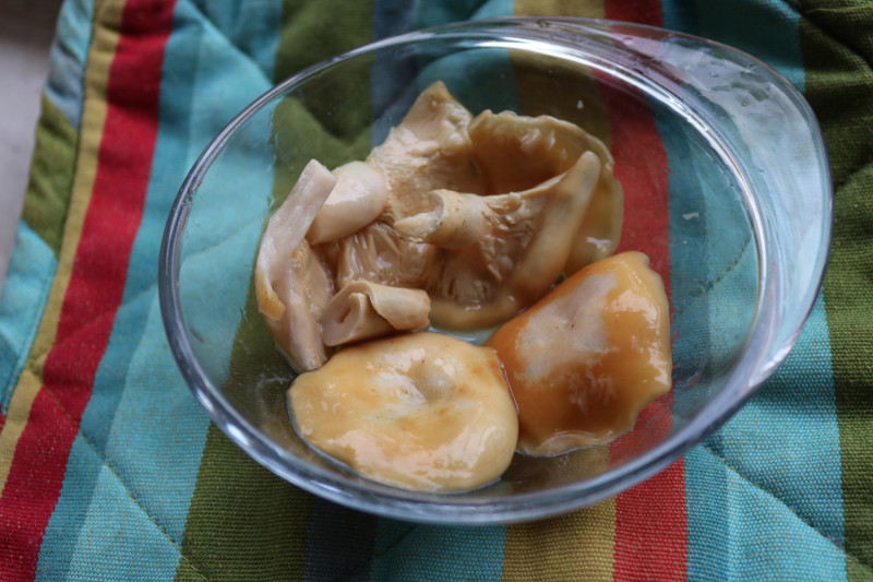 Ich habe zum Wässern einen großen Topf benutzt der in mein Kühlschrank reinpasste. Hier ist dieser Topf beim Wasser wechseln am Abend (oben lag noch ein Teller mit Gewicht obendrauf um die Pilze unter Wasser zu halten):