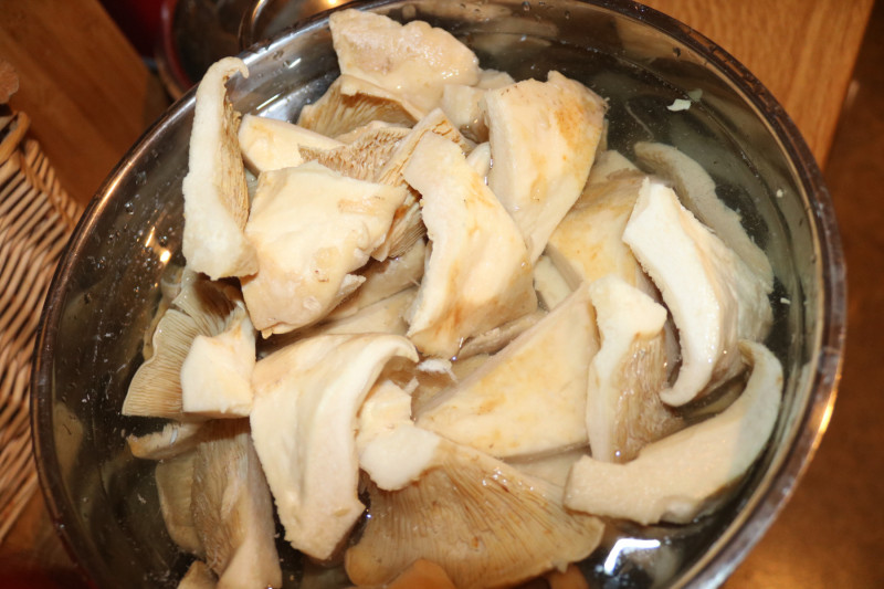 Nach ein paar Stunden kann man sie gut putzen, die großen Pilze halbieren, bzw. vierteln oder achteln, und dann kann das Wässern beginnen.