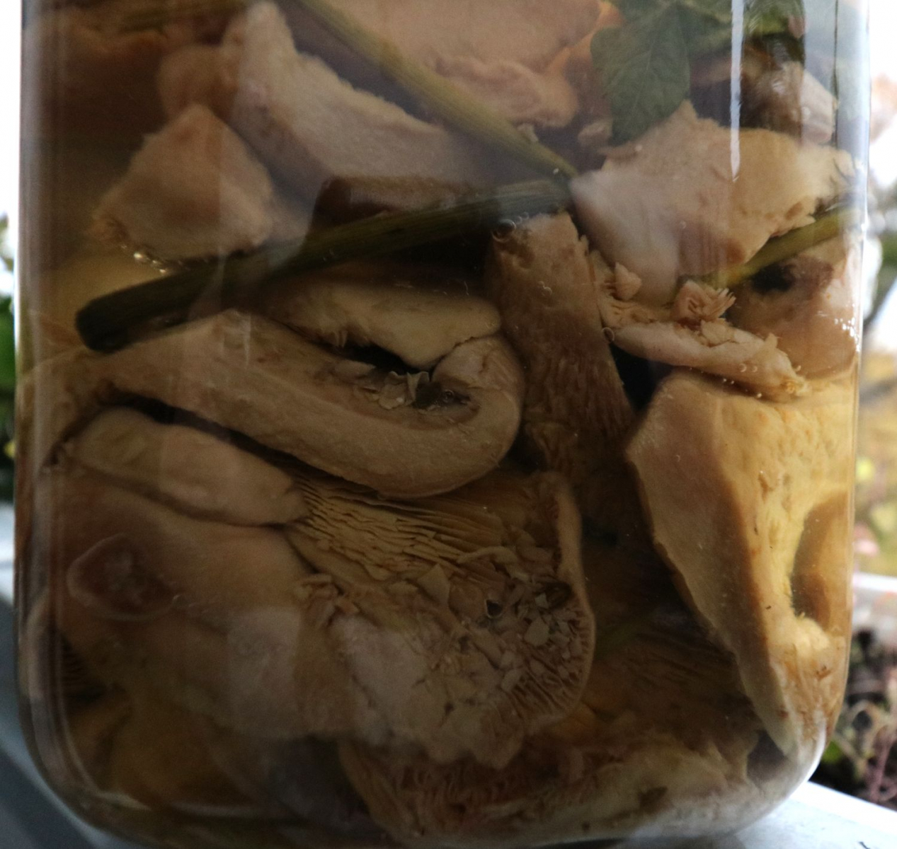 Alles zusammen im Glas geschichtet und beschwert, so dass die Salzlake alle Pilze gut bedeckt. Fertig zum fermentieren!