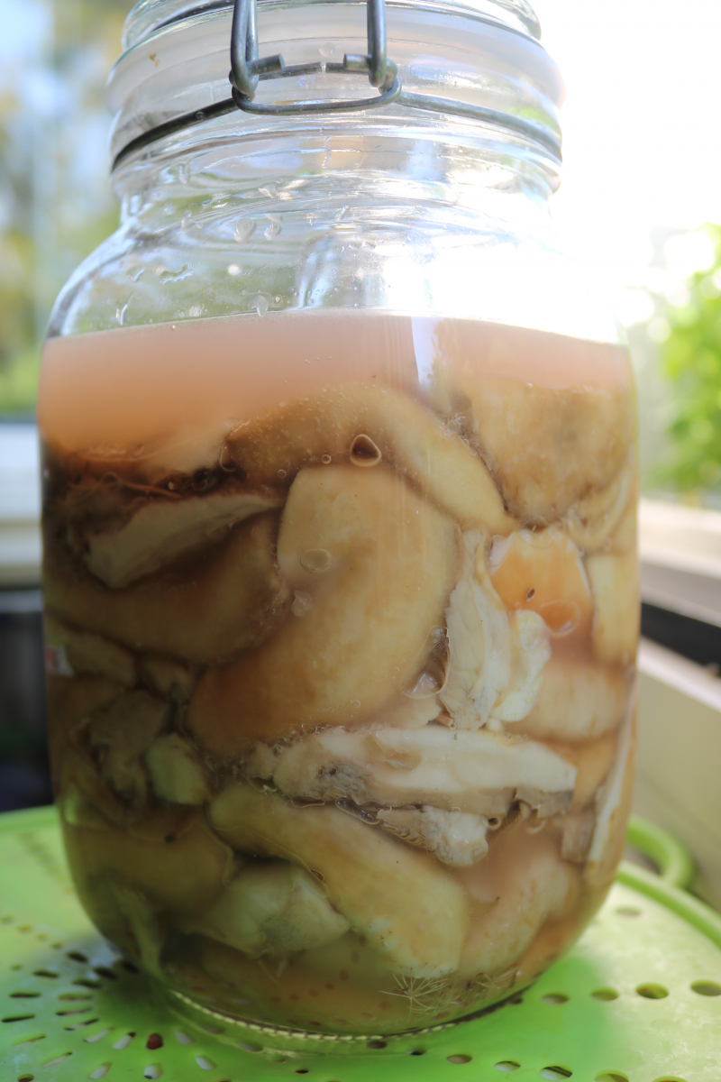 Nach vier Wochen haben wir angefangen die Pilze zu essen (und auch zu verschenken). Sechs Wochen später sind die Gläser bereits so, halb leer: