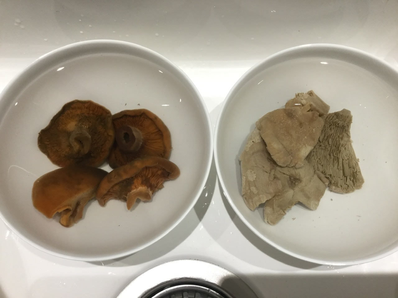 Ich habe zum Wässern einen großen Topf benutzt der in mein Kühlschrank reinpasste. Hier ist dieser Topf beim Wasser wechseln am Abend (oben lag noch ein Teller mit Gewicht obendrauf um die Pilze unter Wasser zu halten):