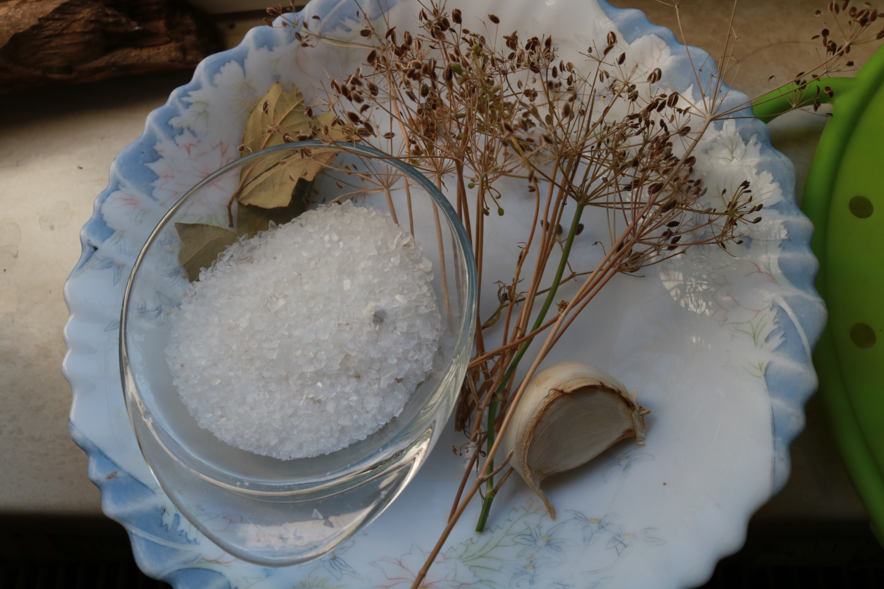 Die Gewürze: Lorbeerblätter, Dill (getrocknete Blüten), Knoblauch + grobes Steinsalz (abgewogen, 50g pro 1kg Pilze):