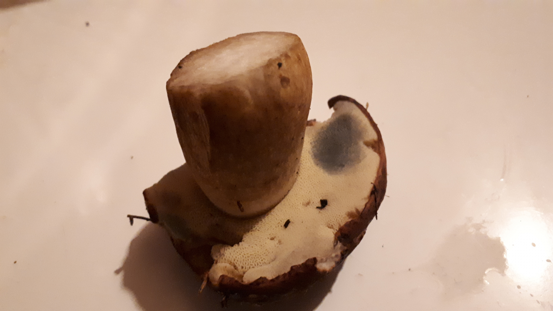 Habe ich hier eine etwas dickfüßliche marone gefunden? Fichtenwald, blaufärbung dercröhren auf druck, stiel kein netz... lg