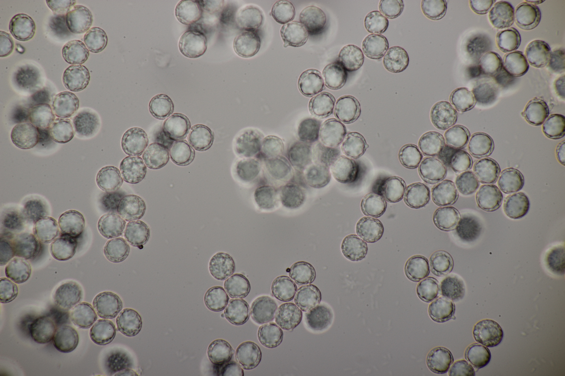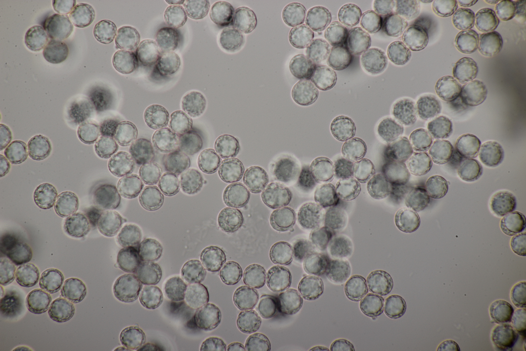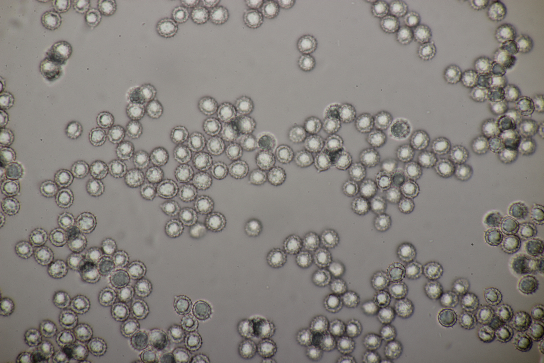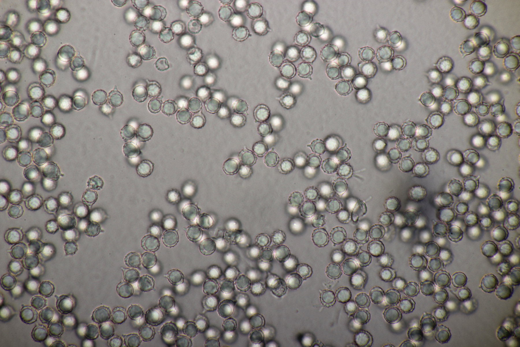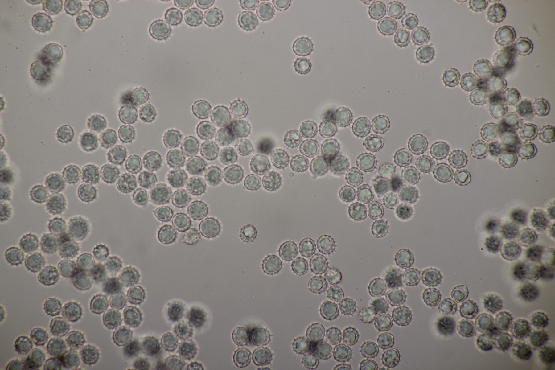 10. Noch ein Täubling unter Buche, Eiche und Birke. Geschmack sofort scharf. Sporengröße (7.6+-0.5) µm x (6.3+-0.5) µm, Sporenpulver Ib, evtl. auch IIa. FeSO4 rosa, Guayak nach 20 Sekunden langsam leicht bläulich.