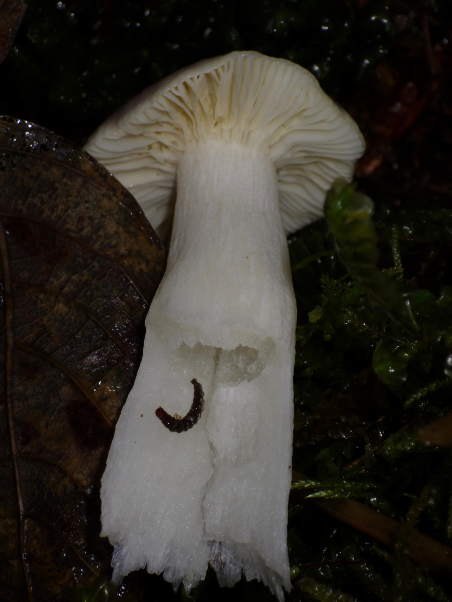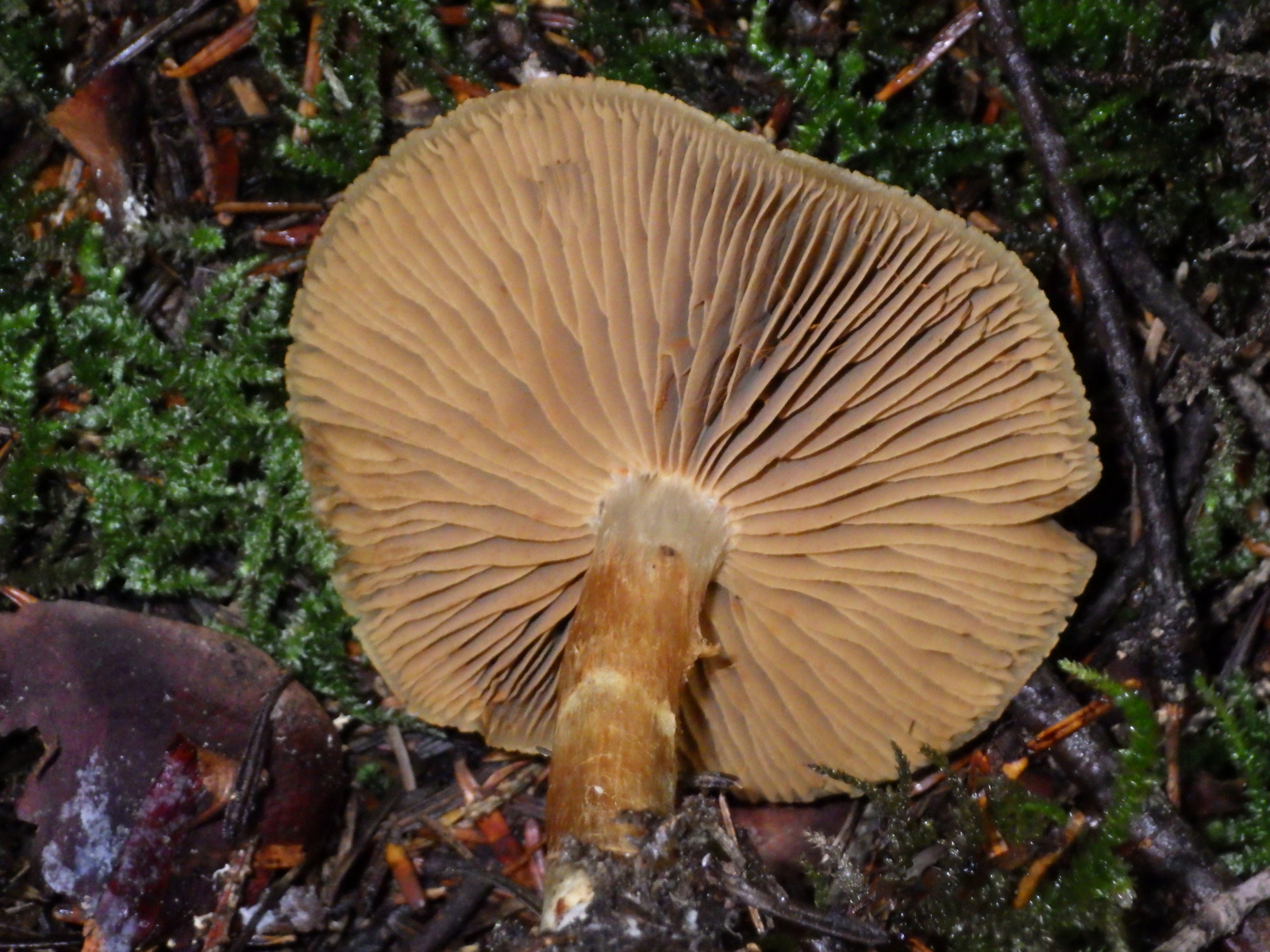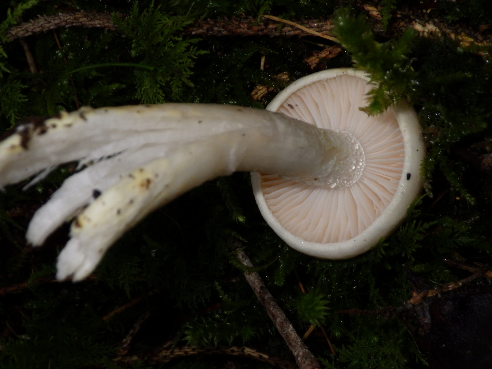 9) Ein kleiner hellbrauner Pilz mit weissen Lamellen und faserigen Stiel, eingerolltem Hutrand, eine Schneckling Spec.?