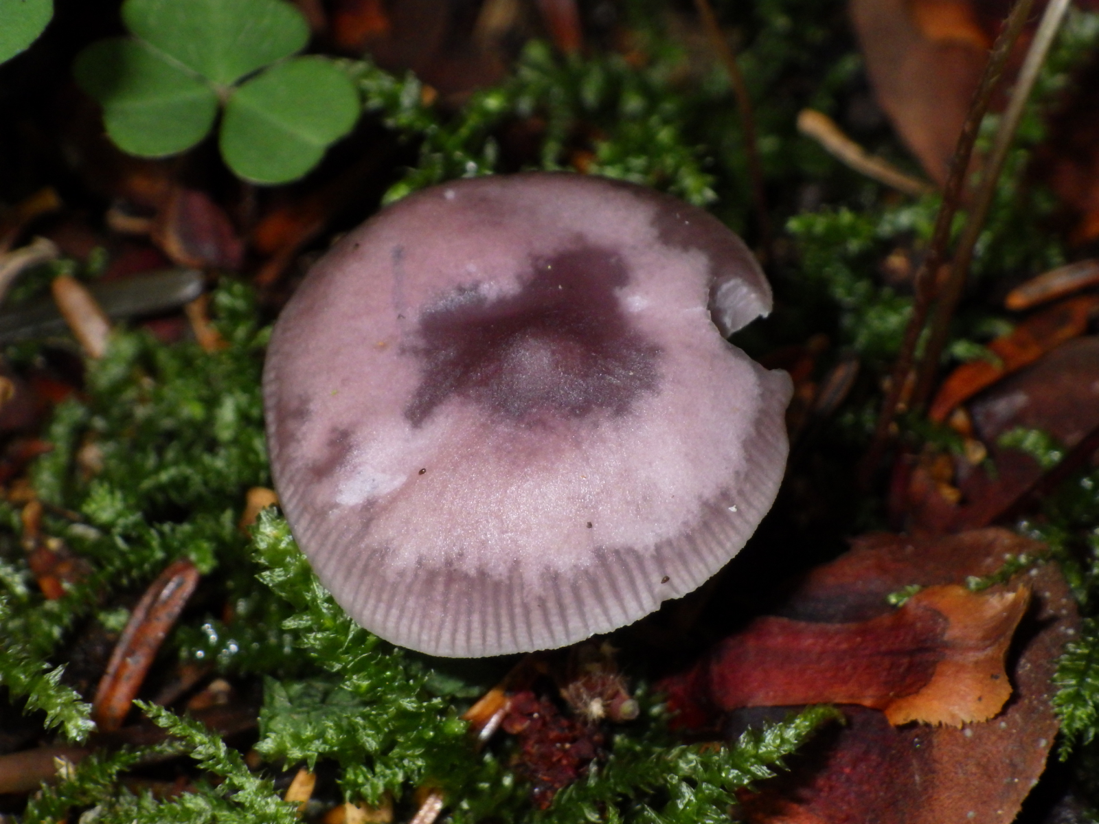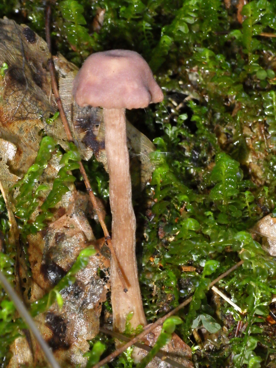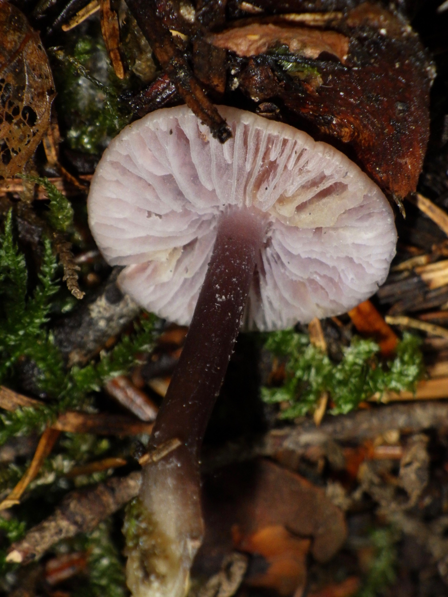 11) Ein einzelner kleiner braunvioletter Pilz mit kleinem gewelltem Hut, langem braunem Stiel, habe keine Ahnung?