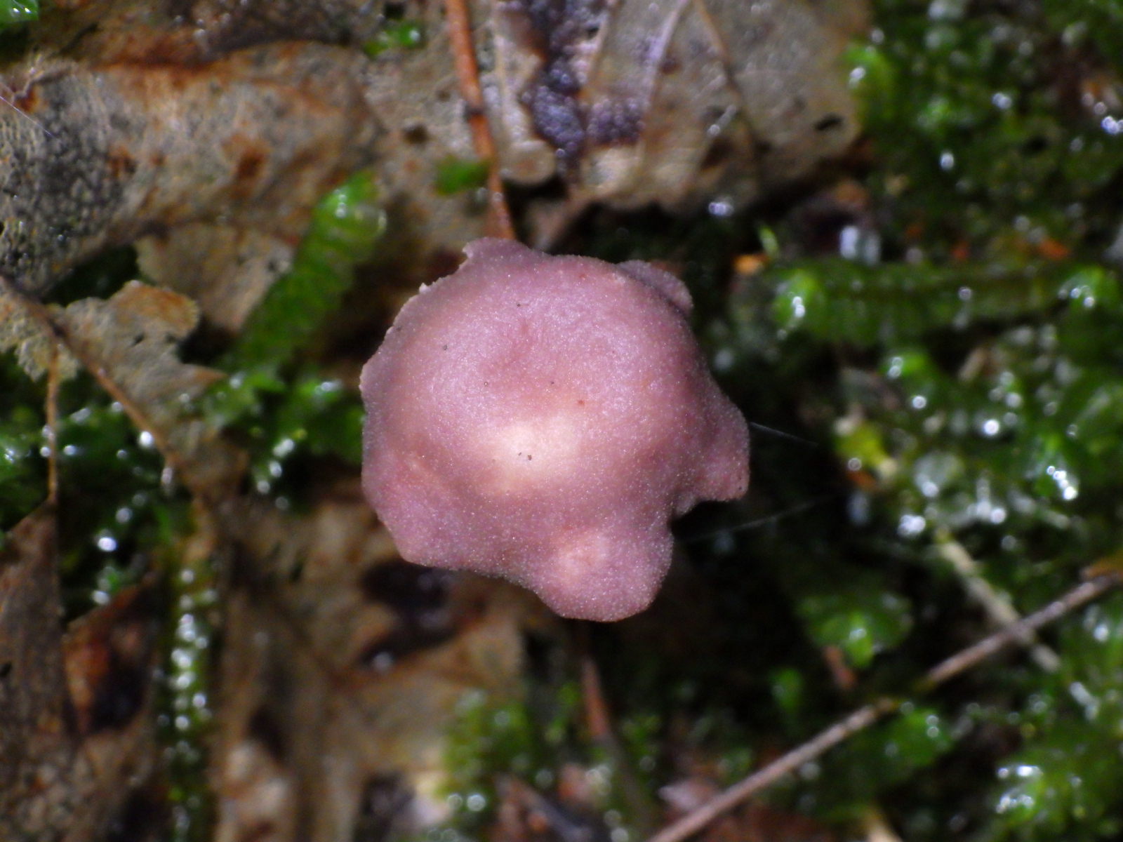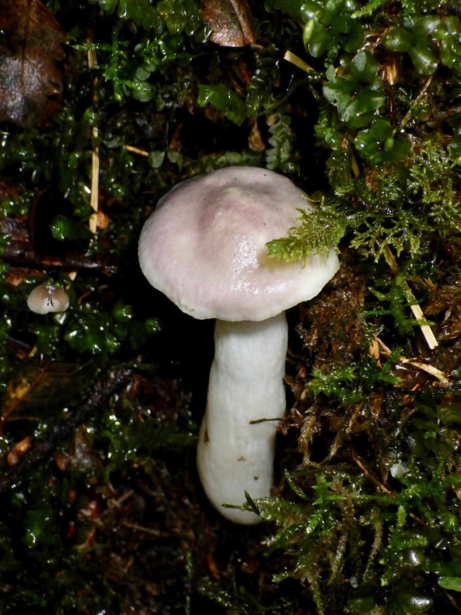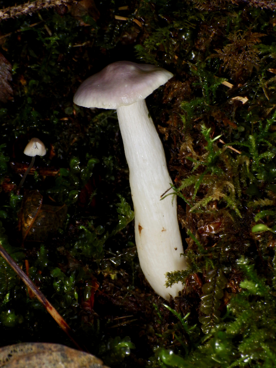 11) Ein einzelner kleiner braunvioletter Pilz mit kleinem gewelltem Hut, langem braunem Stiel, habe keine Ahnung?