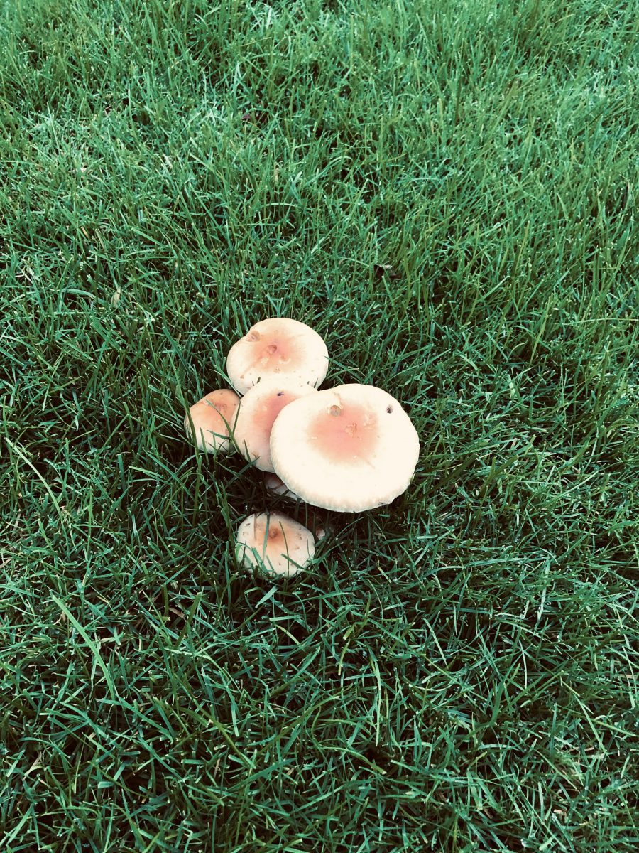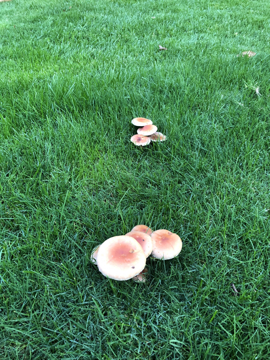 Sieht aus wie Pilze, wenn man nur so von oben guckt... Wenn ich jetzt "könnten Ziegelrote Schwefelköpfe sein" schreibe, dann bekomme ich möglciherweise (völlig zurecht) eins auf's Dach von den anderen Teilnehmern. Weil: Man müsste mindestens mal einen oder zwei umdrehen und von unten gucken.