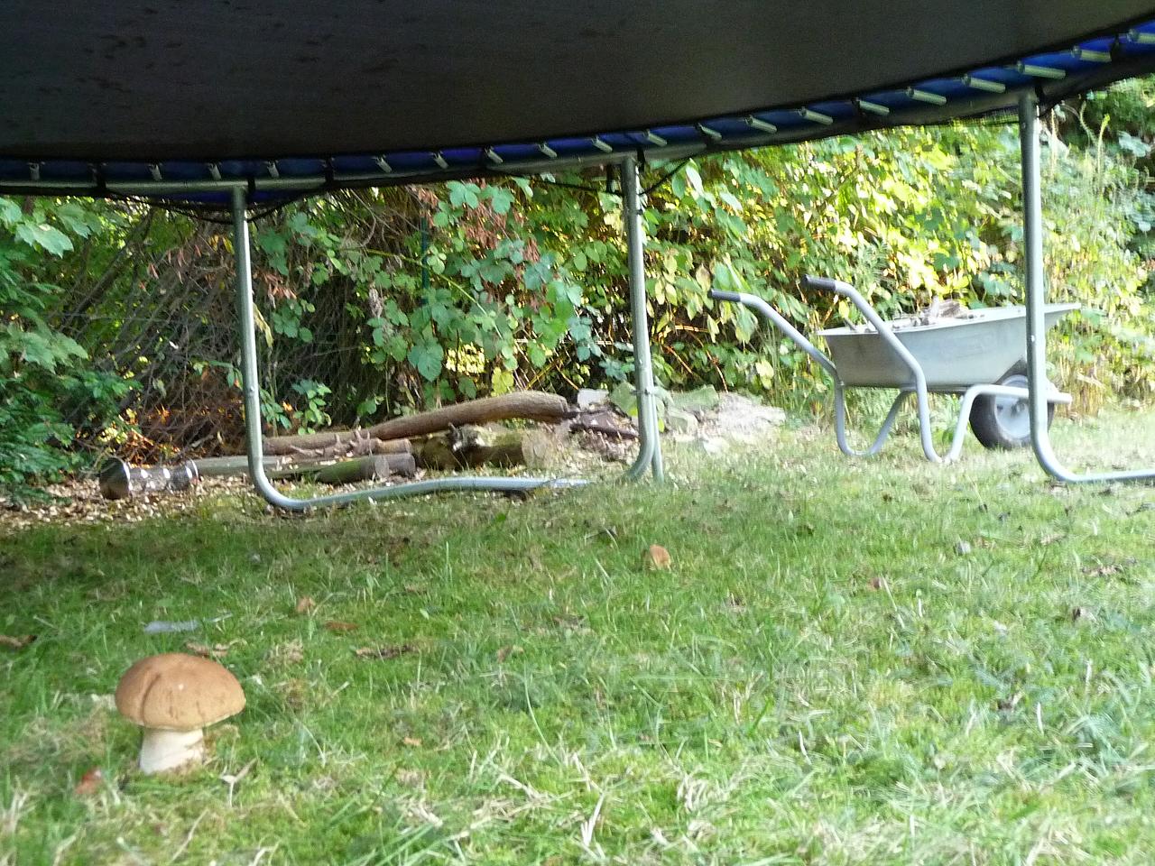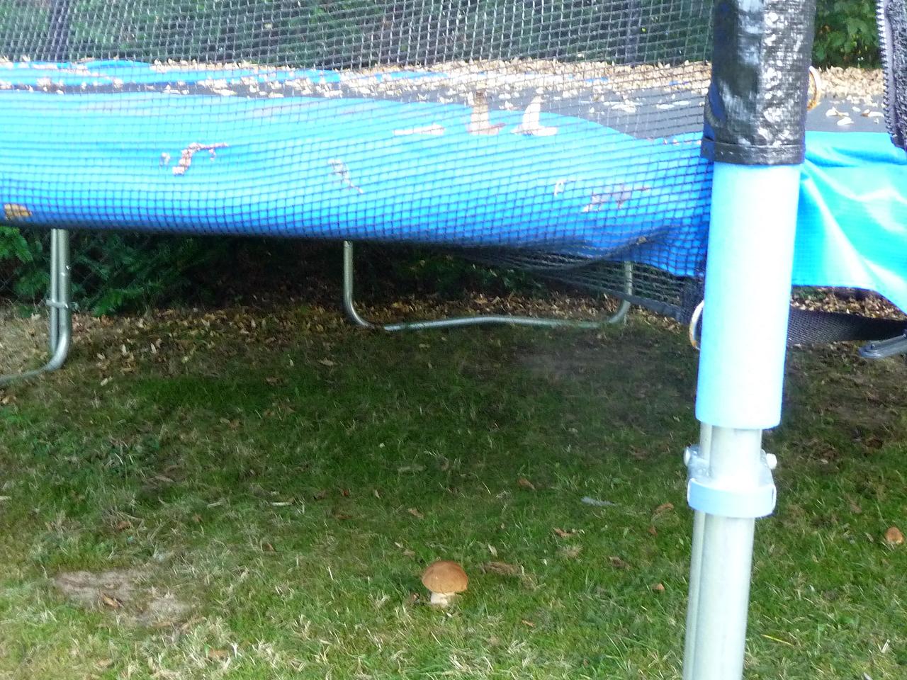 oh, Pilze unter dem Gartentrampolin! Ui, sieht aus wie ein Steinpilz.