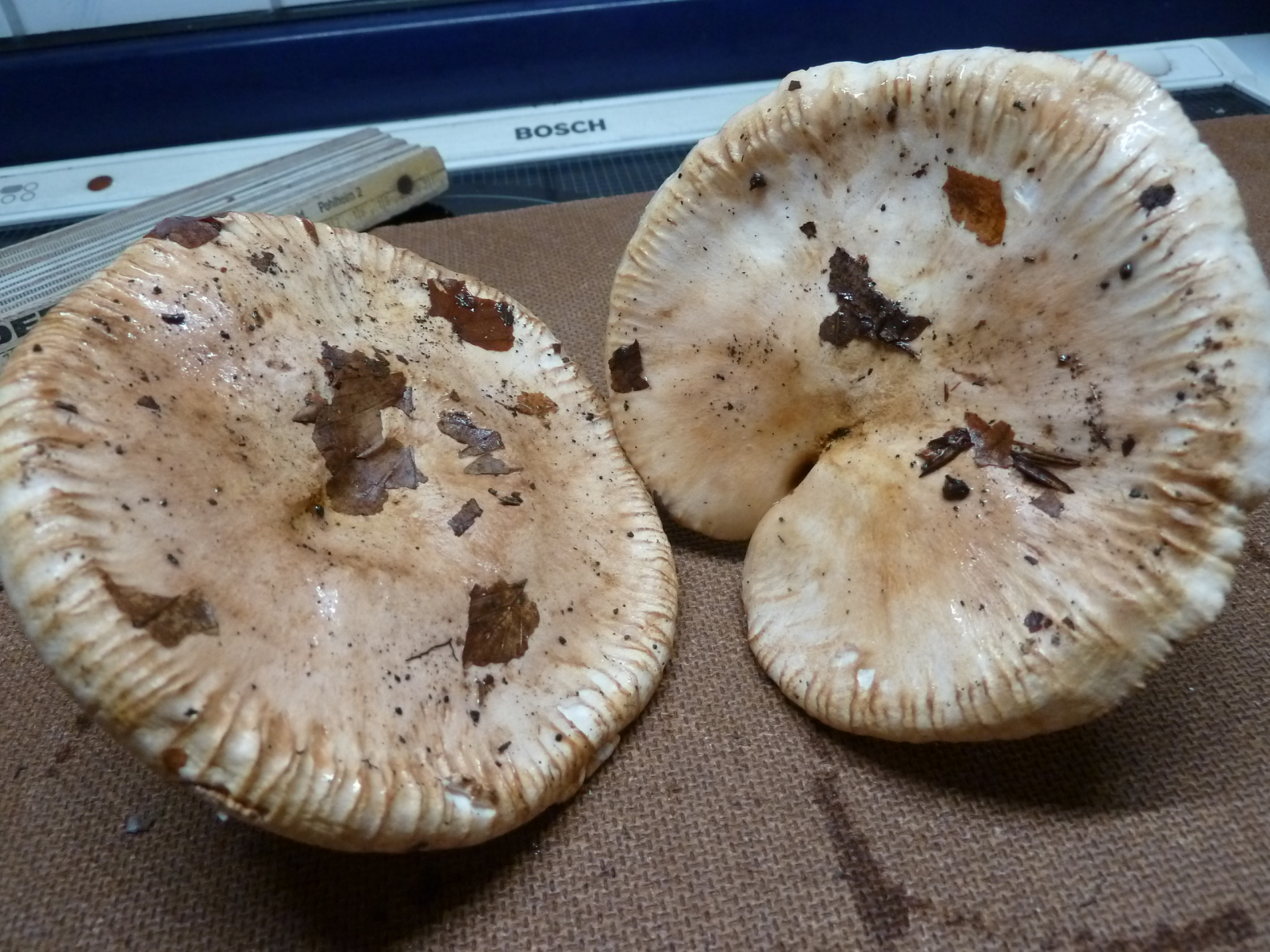 Hier der vierte Fund des heutigen Tages im Eichen-Hainbuchen-Mischwald auf basischem Basalt. Da ich nicht einmal die Gattung kenne, nenne ich ihn "geflecktblättriger Krempling" wegen seines Aussehens. Hinzu kommt die im Randbereich sehr markante Hutstruktur, so ausgeprägt habe ich das bislang nicht gesehen. Praktisch ohne Geruch, Huthaut feucht deutlich schmierig. Hat jemand eine Idee?