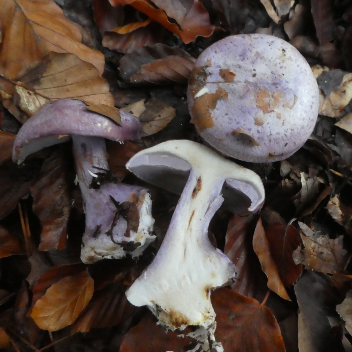 Gefunden habe ich die Pilze am 16.10.2019 im Altmühltal in einem Mischwald der überwiegend aus Rotbuchen bestand. Entlang des Weges wuchsen etliche Meter lang zig Cortinarien bunt durcheinander. Auf dem ersten Foto sieht man drei davon, wobei zwei meiner Meinung nach Rosaviolette Klumpfüsse sein könnten (rechts und in der Mitte), der dritte Pilz (links) ist offensichtlich eine andere Cortinarie.