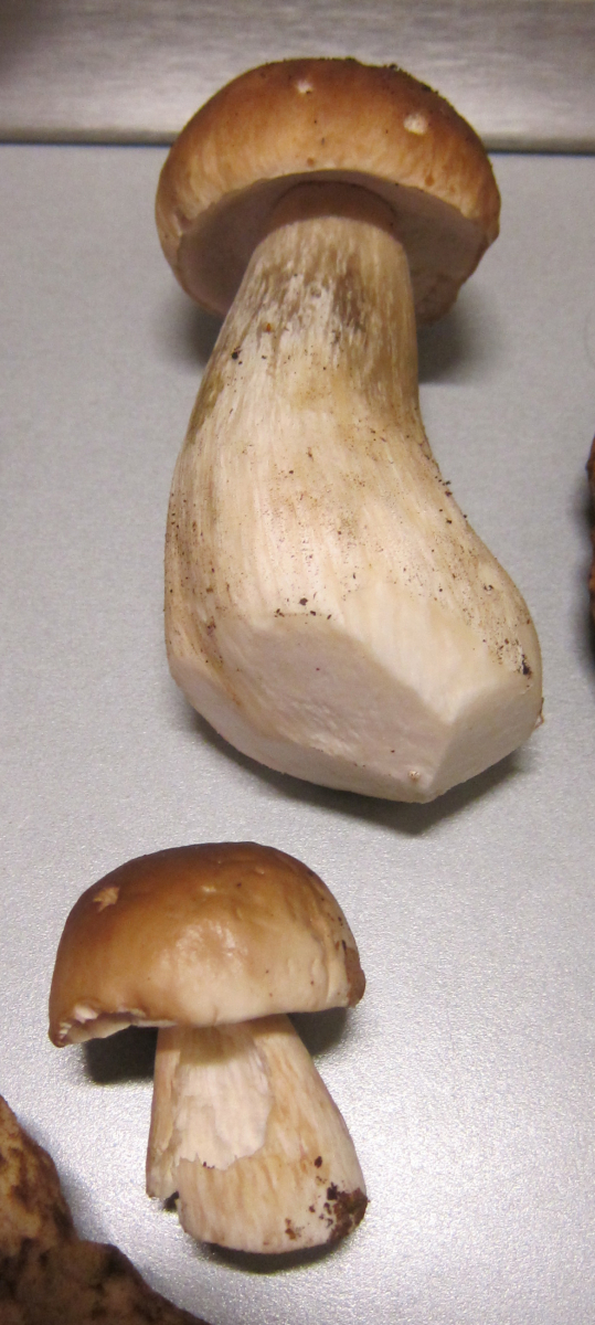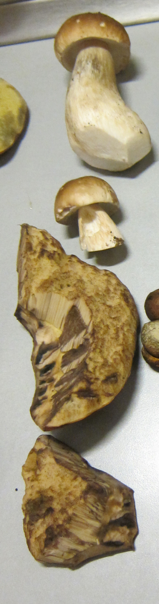 Bei den Steinpilzen liegt ein unkenntliches größeres Stück Pilz dabei - kein Mensch kann Dir sagen was dies für ein Pilz ist. Und selbst wenn, wie ist den die Konsistenz des Fleisches? Ich vermute ziemlich elastisch oder? Weg damit!