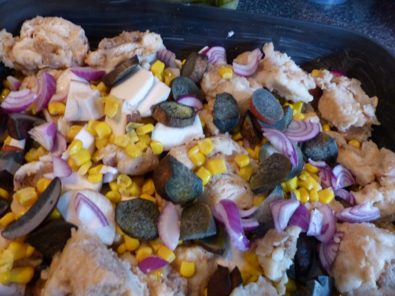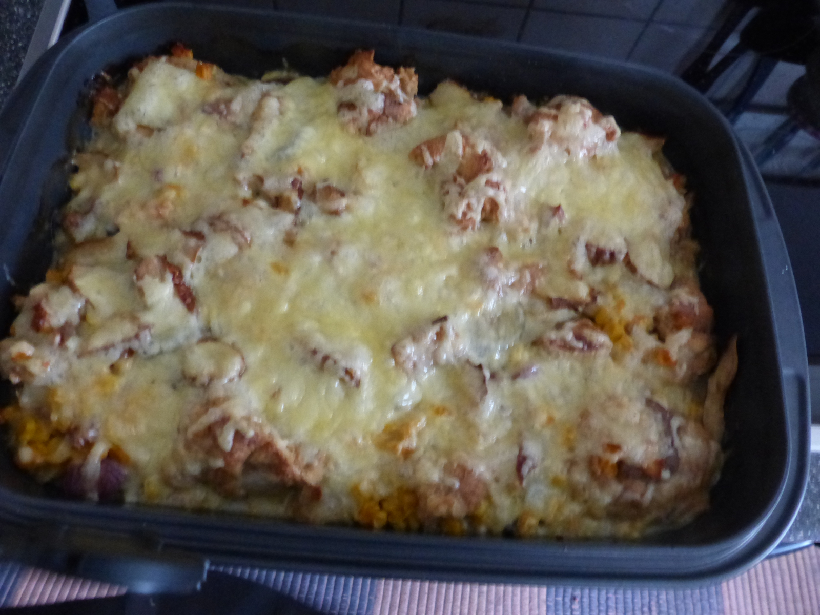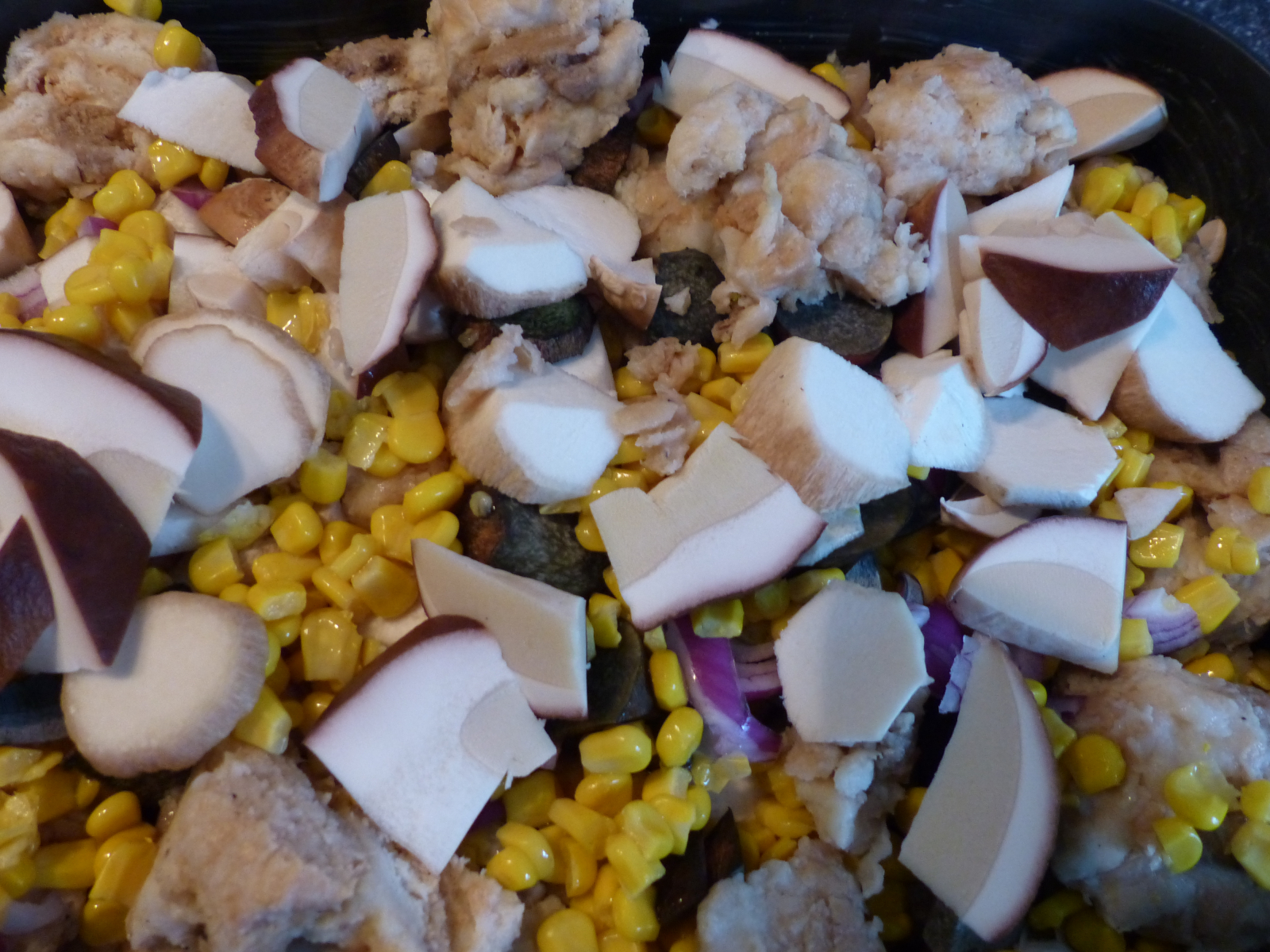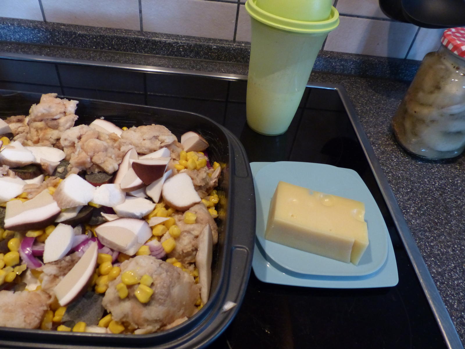 in meiner Verzweiflung habe ich heute mal einen Auflauf gemacht. Mit Semmelknödel, Steinpilze, Käse, Mais und einwenig Zwiebeln. Wers nicht mag, der läßt sie weg.