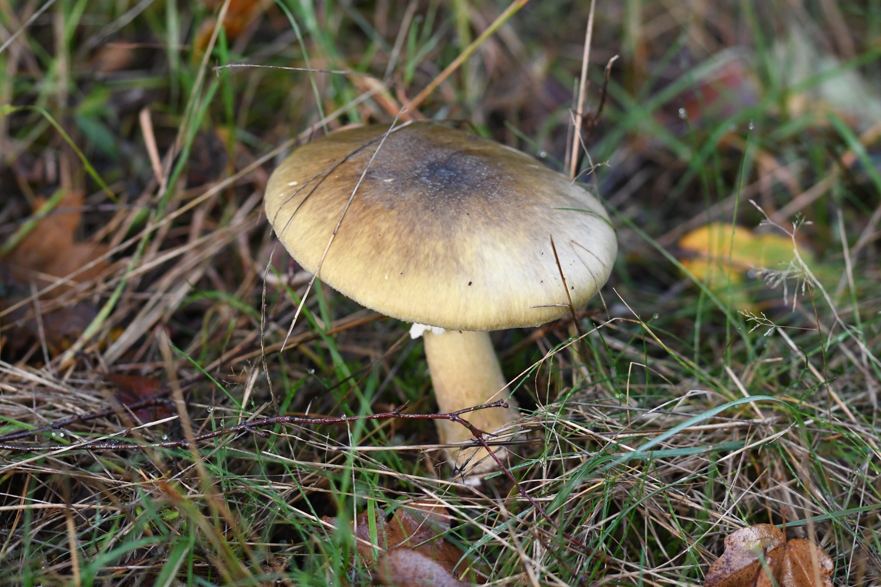 Von der Abbildung her wäre ich hier bei A. phalloides. Der muss nicht immer deutlich grün sein, die Hutfärbung kann sehr stark variieren. Und die Riefung des Rings bei fehlender Hutriefung spräche dafür. Die Knolle ist ohne die hautigen Velumreste untypsch, aber das gilt auch für A. gemmata. (Oder sind die beim Entnehmen im Boden zurückgeblieben?)