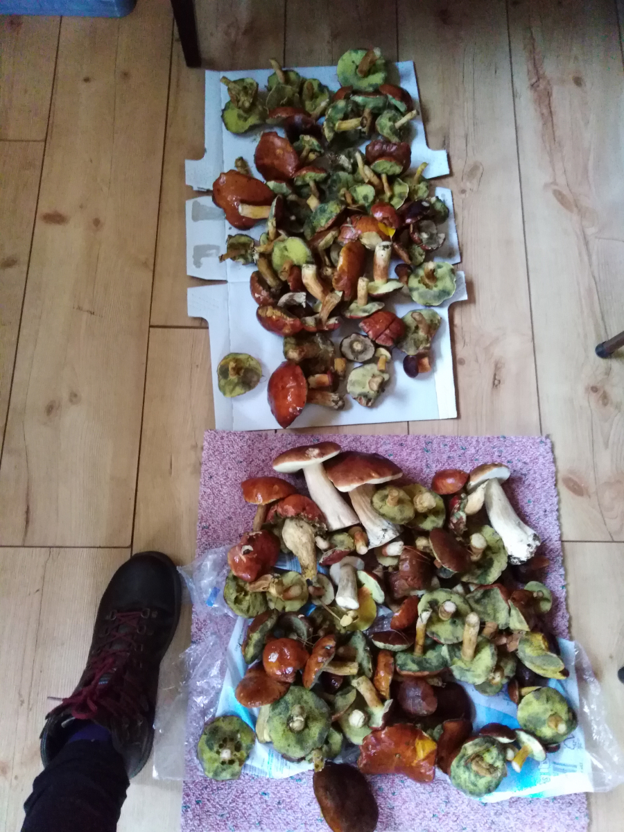 Ich sehe ziemlich viele (zu) alte Maronen und ein paar Steinpilze. Ob da noch etwas anderes liegt, ist sehr schwer zu erkennen bei solchen Bergen.