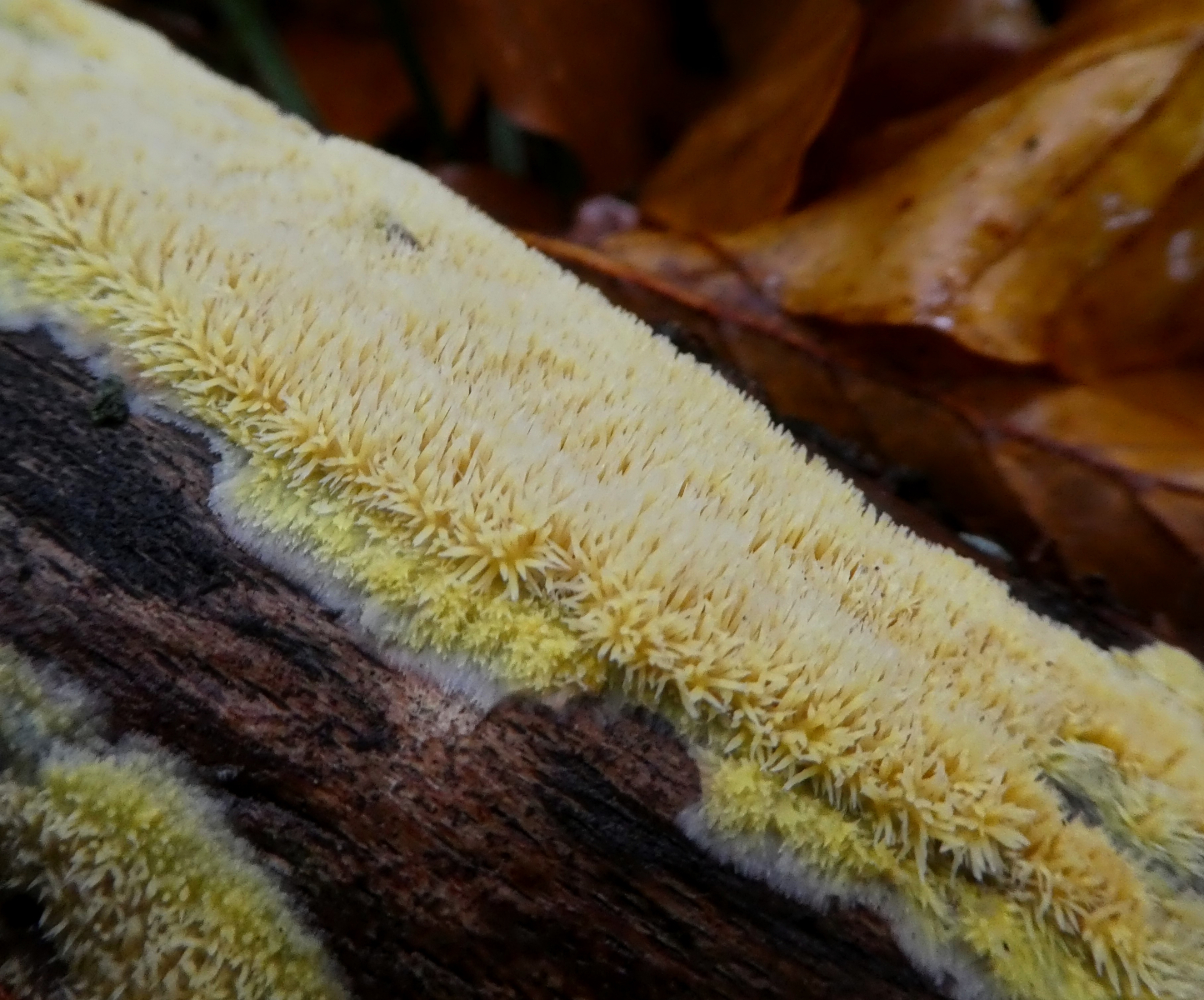 Mit dem Aussehen kommt in den allermeisten Fällen >Phlebia uda< raus. Wenn du KOH 5% zur Hand hast: Mach mal einen Tropfen auf den Pilz, das würde dann dunkelrot bis violett verfärben. Bitte keinie höhere Konzentration für solche Rindenpilze verwenden, das gibt sonst verfälschte Reaktionen.Das zweite ist eine Art aus der Gattung "Steccherinum", vom optischen her (kaum Hütchenbildung und kurze, eher blas orangene Stacheln) am ehesten Steccherinum ochraceum.