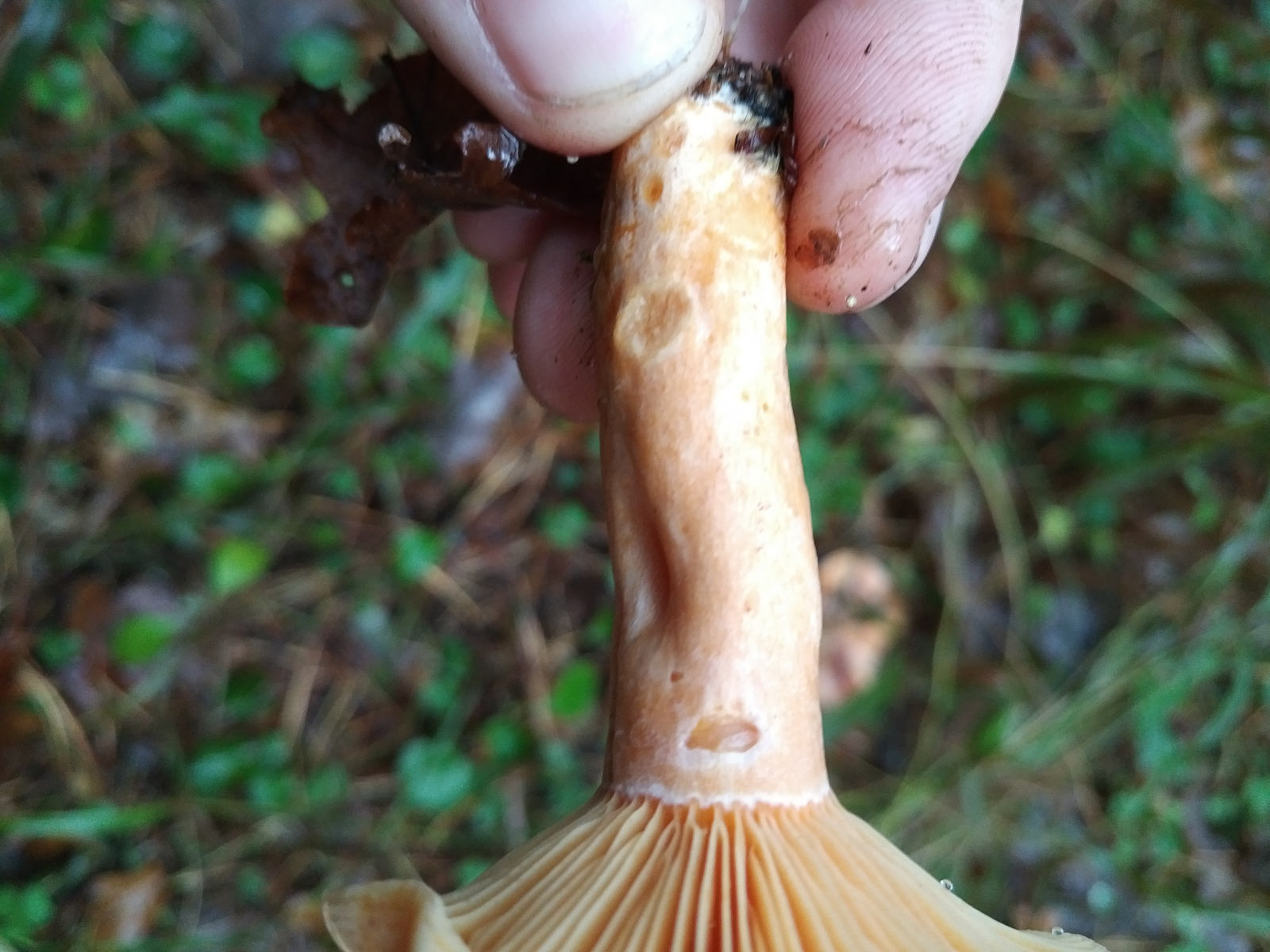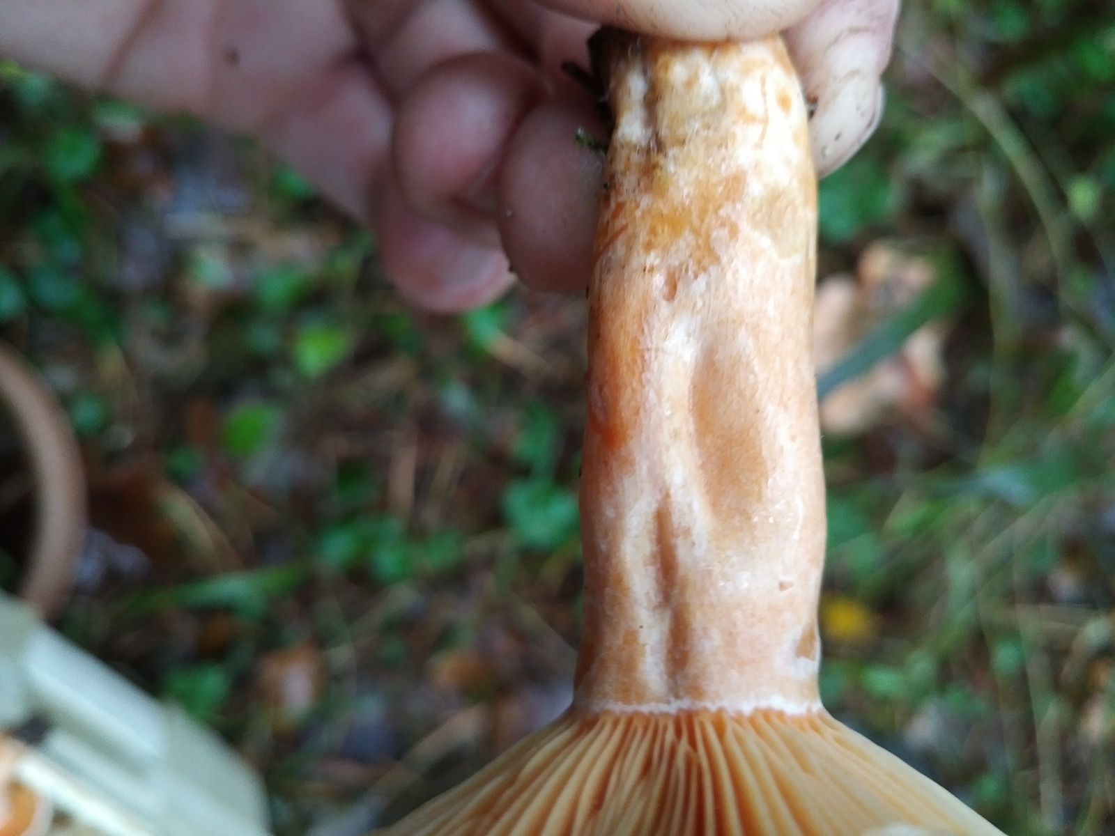 ich war heute wieder im Wald unterwegs und habe diese Pilze hier gefunden, die ich für Edelreizker oder eventuell eine andere Reizkerart halte. Sie wuchsen bei einer Kiefer. In der nahen Umgebung waren Kiefern und Eichen. Aus der Schnittstelle trat sofort orange bis karottenfarbige Milch aus. Jetzt nach 2,5 Stunden ist Schnittstelle zwar eingetrocknet, hat sich farblich jedoch kaum verändert, nur etwas blasser geworden. Ein junges Exemplar hat grünliche Verfärbungen. Alle Exemplare haben relativ wenige Grübchen finde ich.