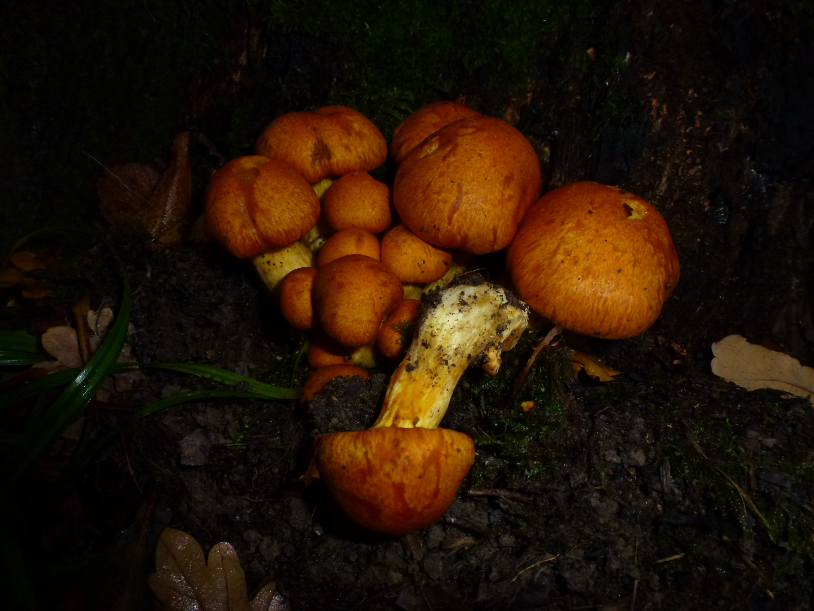 Substrat: An einem (vermutlich) Laubholzstubben, Größe: der liegende Pilz ist etwa 7cm lang Geruch: irgendwie unangenehm, kann es noch nicht ganz erfassen, das werde ich auch noch mal überprüfen. Hut: leuchtend orangerot mit Flecken, ein bisschen wie Wasserflecken, Stiel: eher blassgelblich mit orangenen "Verschmutzungen". Lamellen noch nicht zu sehen, noch von einer Faserschicht geschlossen, ein bisschen wie Schleierlinge.