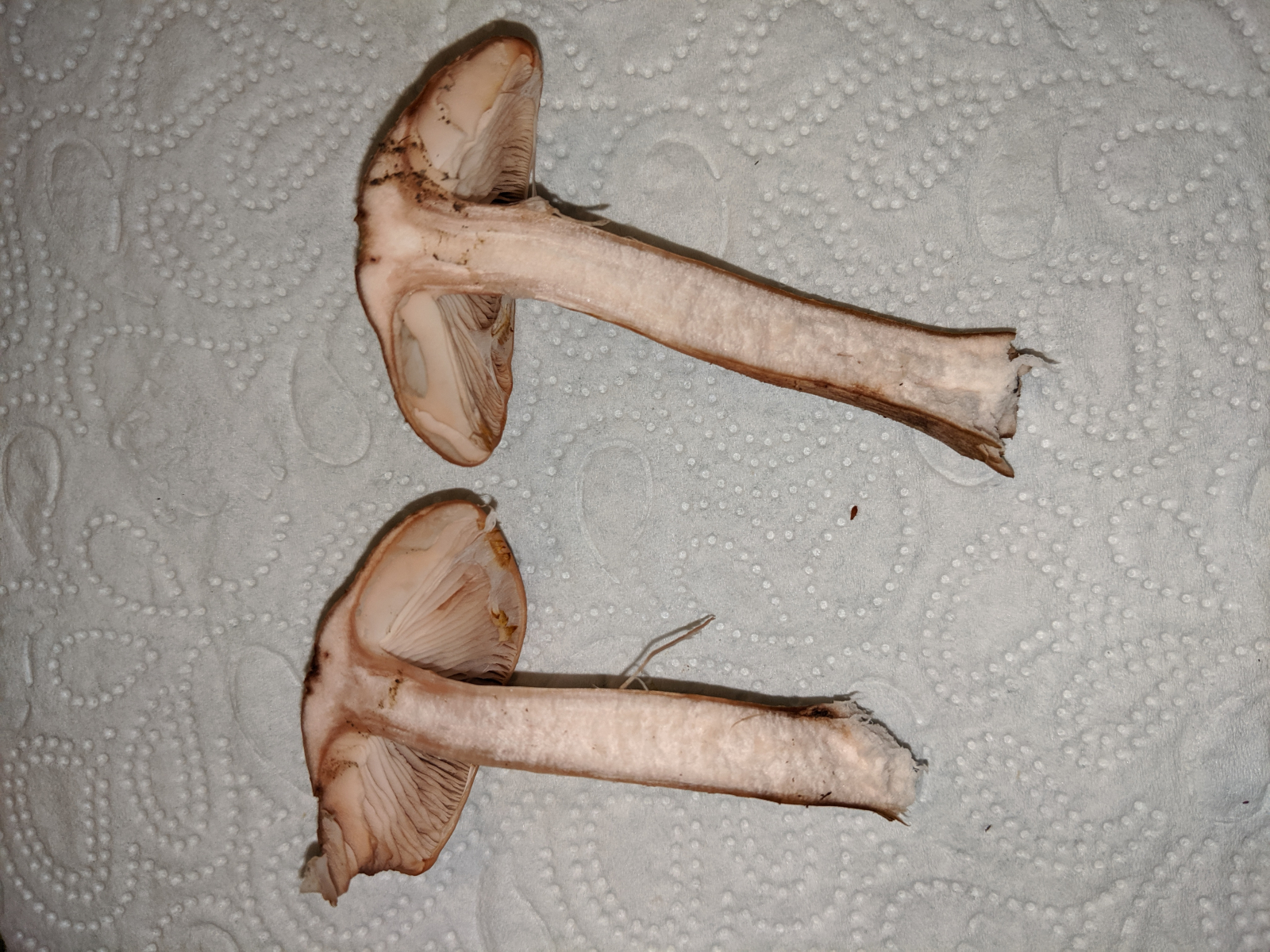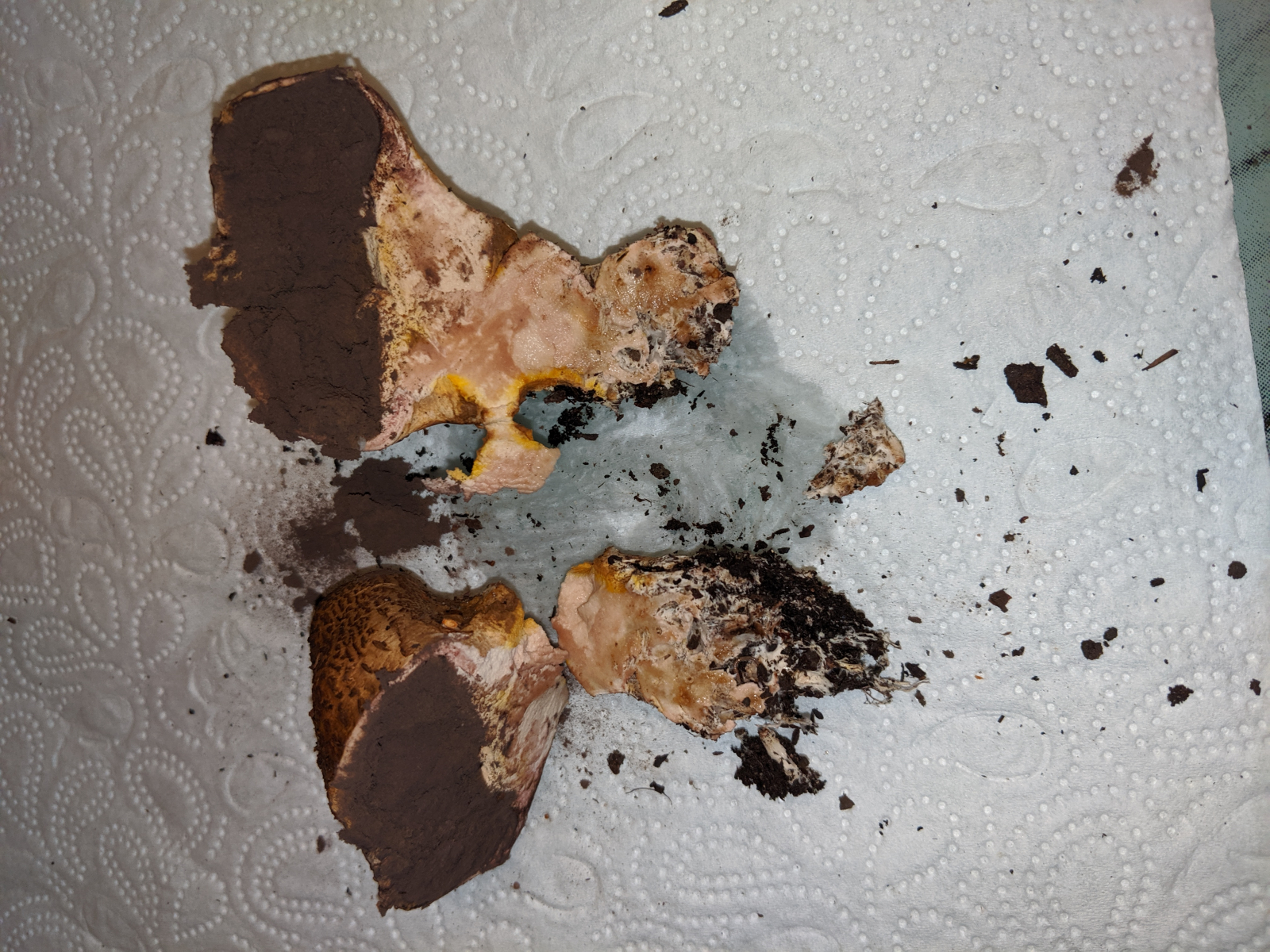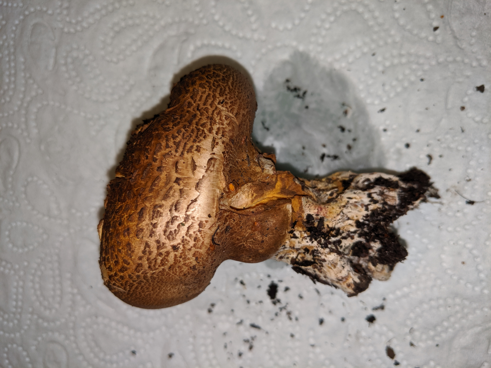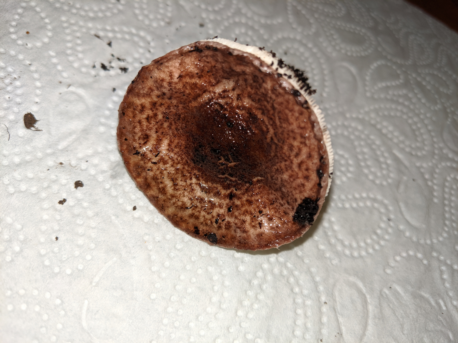 Die nächsten 4 Bilder einzeln stehender Pilz ebenfalls auf Rindenmulch unter Farn. Geruch leicht holzig.